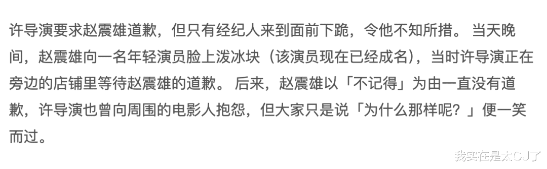 也有纪录片导演许哲发长文认证了赵震雄用冰块砸新人演员A的爆料,并表示自己曾在头一天电影开机祭祀仪式后无缘无故被坐在旁边的赵震雄打了脸。