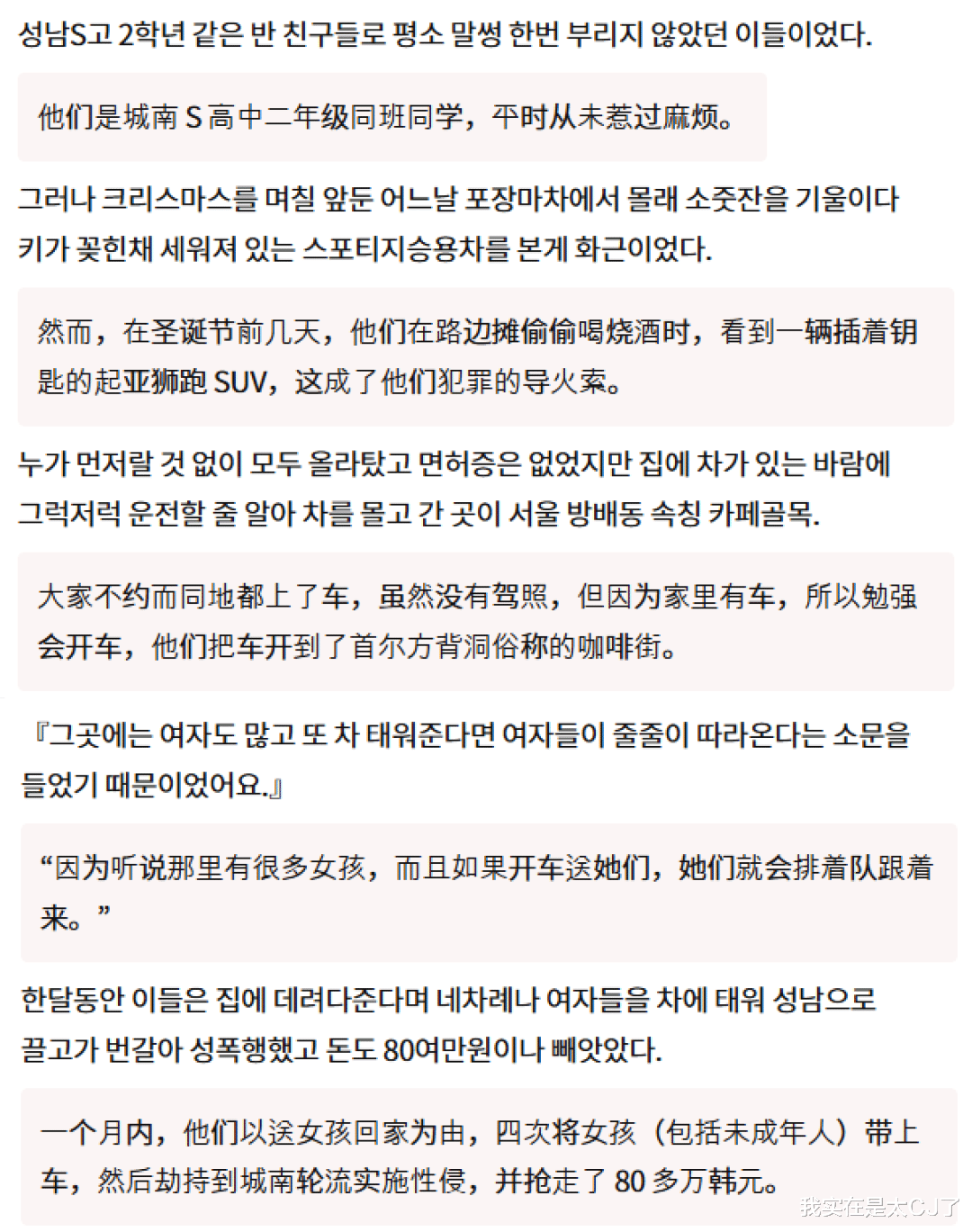 先是偷停在娱乐场所附近那些还没熄火的车当“诱饵”,打着“开车送你回家”的名义搭讪和自己同龄(未成年)或者年纪稍长些许的年轻女孩,将人带到首尔城南轮流侵犯后还要抢走她们的财物。