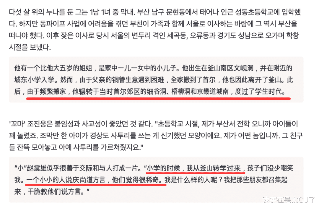 在2012年某次专访中,演员赵震雄说自己小时候因为父亲生意困难而全家搬到首尔,有很长一段时间辗转在细谷洞、梧柳洞和京畿道城南,刚转学时同学们还嘲笑过他说庆尚方言。
