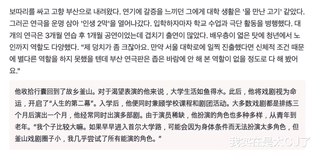 事无巨细到这种程度,按理来说在介绍自己表演兴趣起源也就是加入话剧社的高中时期会展开去聊更多对吧?可他竟然含糊带过,只说自己能成为演员是因为高考成绩出来后选择报考家乡庆星大学戏剧电影系。