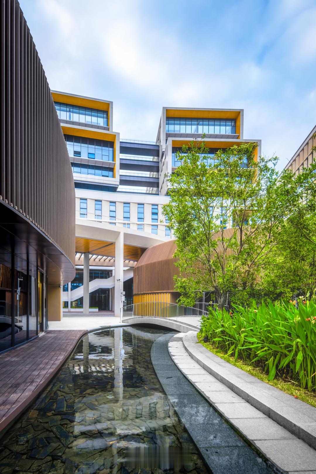 浅蓝色玻璃幕墙再配上木色线条,科研实验楼以“U”形相连,展现出一种理性克制的美。新材料、信息、生命、智能制造等多领域的实验室、平台将在此探索创造。