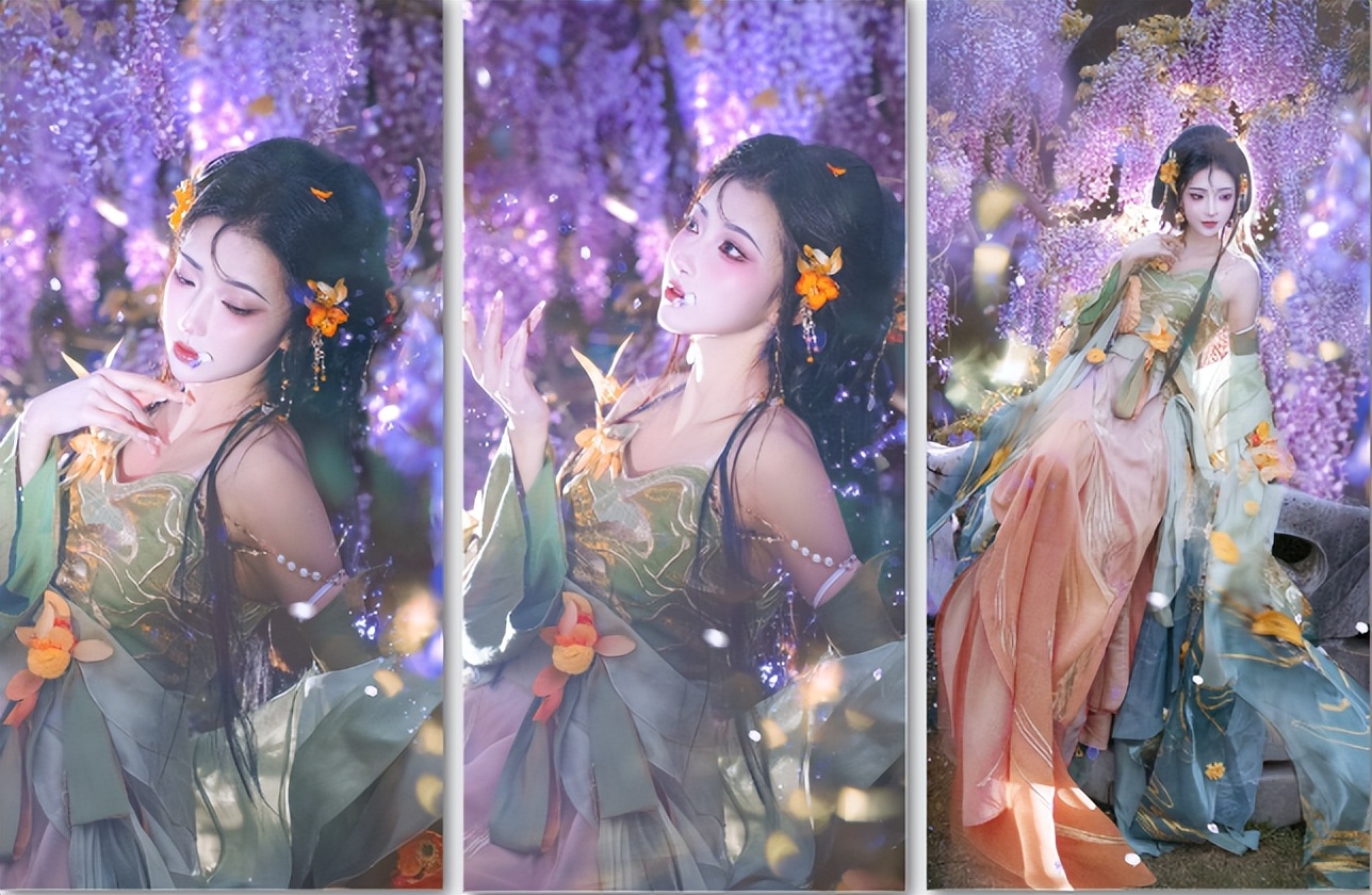 女款则温婉如诗,紫藤花影间静坐,衣摆铺陈如花瓣相融,感觉像是误入凡尘的仙子在拍《倩女幽魂》电影版。