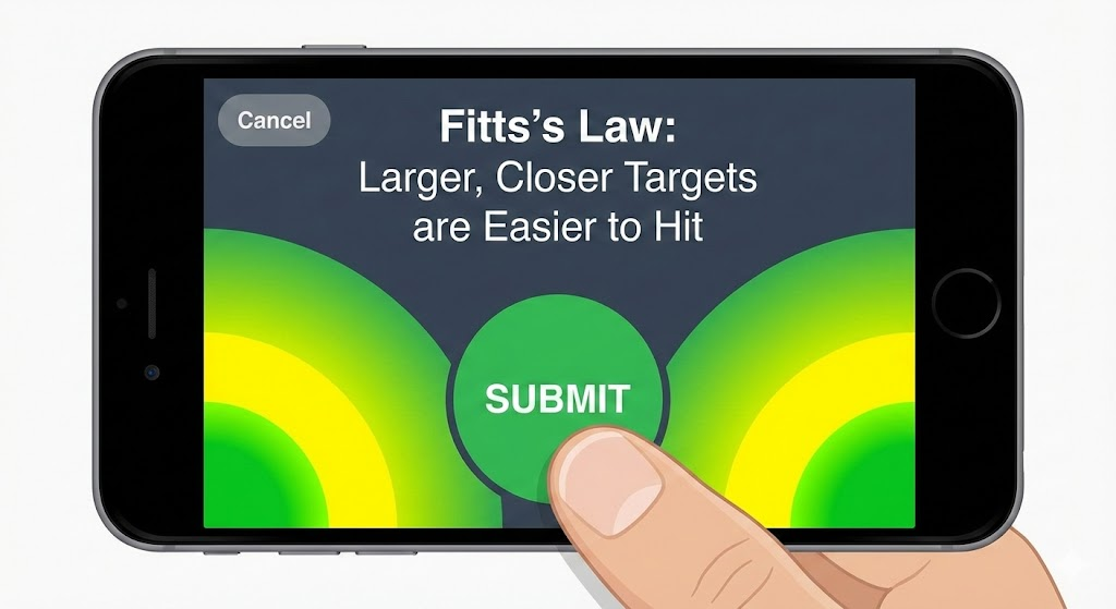菲茨定律告诉我们,移动到目标的时间由“目标的距离”和“目标的大小”决定。在 UI 设计中,这意味着那些最高频、最重要的操作,必须做得足够大,且距离用户的操作距离足够近。