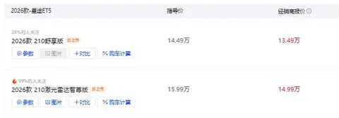 星途ET5提供两种版本:210舒享版和210激光雷达智尊版,指导价分别为14.49万元和15.99万元。超级置换价分别为13.49万元和14.99万元。购车用户还可以享受五大购车权益,总价值达52800元。具体权益包括:驾驶礼,猎鹰700城区NOA功能终身免费使用;置换礼,全系享10000元超级置换补贴;免税礼,至高享7000元购置税差额补贴(限2025年12月10日24:00前锁单成功且厂家未完成交付的用户;无忧礼,限时免费赠送价值4000元智能辅助驾驶无忧权益(限210激光雷达智尊版);炫彩礼,限时优惠3000元选装价值6000元晴空蓝高定车漆。此外,首任车主还可享受终身免费基础流量、3年娱乐流量免费(10G/月)、整车终身质保、终身免费道路救援等三大基础权益。(具体详情请咨询当地经销商)