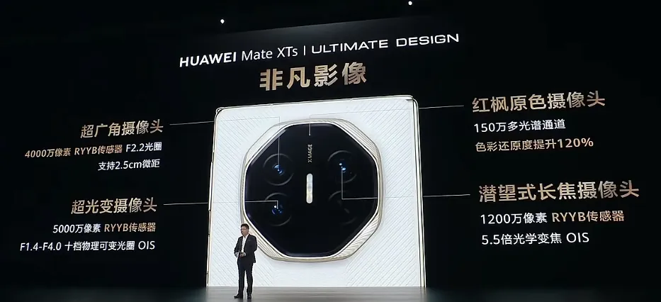 这次华为发布的是新款三折叠Mate XTs手机,摄像头略有升级,采用了4000万像素超广角摄像头+5000万超光变摄像头+150万红枫原色摄像头+1200万像素潜望式长焦镜头,支持5.5倍光学变焦和OIS光学防抖。