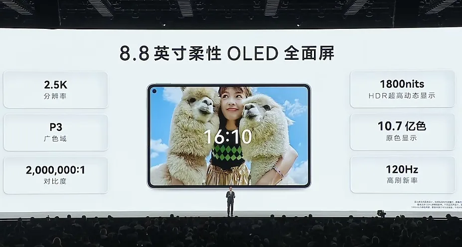 它采用了8.8英寸2.5K+120Hz高分高刷OLED打孔屏,前摄像素是3200万,后摄像素是5000万,屏幕峰值亮度是1800nits。