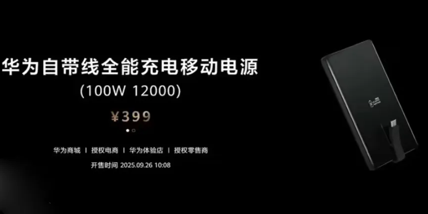除了Mate XTs专属配件外,华为还发布了一款自带线全能充电移动电源,容量是12000mAh,支持100W快充,有黑/白两种颜色,一口价399元。