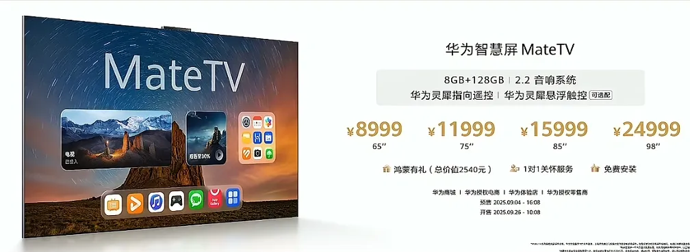 华为还发布了全新智慧屏MateTV,存储组合是8G+128G,支持灵犀指向遥控和悬浮触控(可选配)。其中65英寸卖8999元、75英寸卖11999元、85英寸卖15999元、98英寸卖24999元。