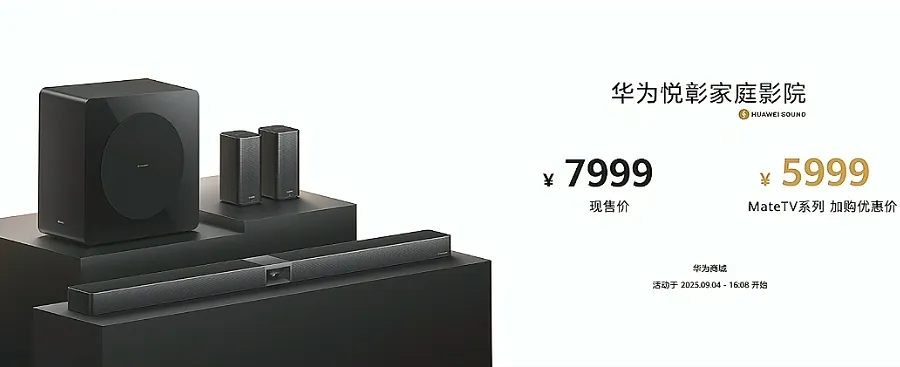 与之配对的是华为悦彰家庭影院,由低音炮、回音壁等四组分体音箱构成,单买价格是7999元,跟MateTV一起买是5999元。