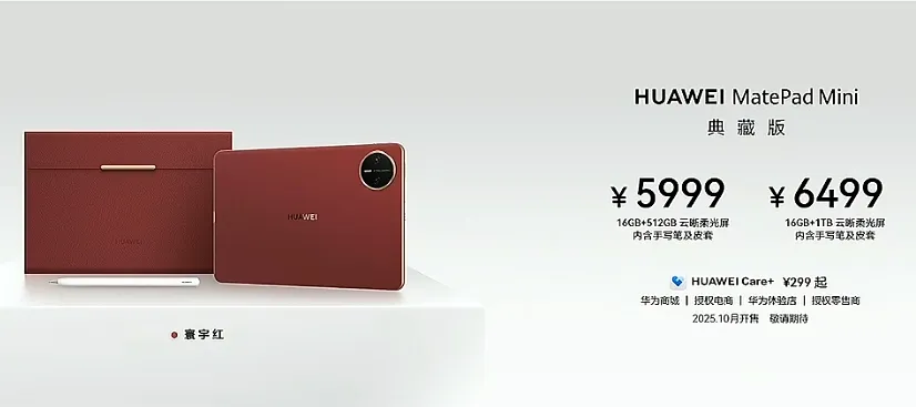 别急,华为MatePad Mini还有“典藏版”和“阅读版”,典藏版16G+512G/16G+1T套装分别卖5999元和6499元,悦读版12G+256G/柔光屏分别卖3299元和3799元。还有一根专用智能皮套,一口价199元。