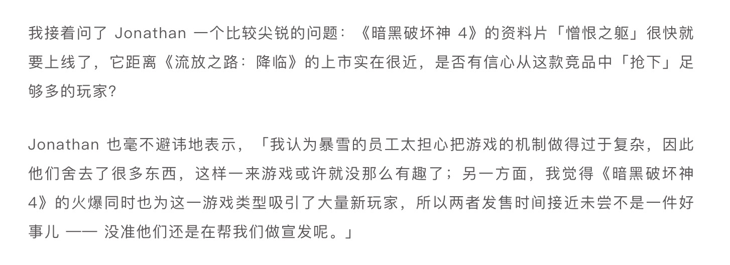 上手体验后很多玩家都表示,POE2才是正儿八经的暗黑续作,甚至有玩家公开建议《暗黑破坏神4》修改游戏品类为“POElike”。事实上,工作室早对这一这群反馈有了预判,此前Jonathan接受IGN采访时就曾表态:GGG并不担心POE2与D4资料片撞档,反而认为D4会成为POE2的广告,吸引火眼金睛的核心用户前来体验。