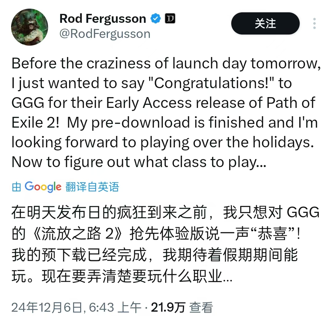 POE2将颠覆ARPG品类,改写暗黑like玩法牌局的实力已势不可挡,甚至在POE2上线之初,《暗黑破坏神4》负责人就在社交媒体上对POE2团队及新作发布表示祝贺。