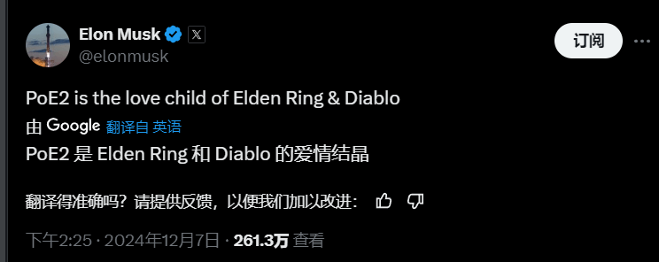 考虑到游戏目前仍在EA阶段,能在发售后有这样高的热度十分难得。不过在2024年的尾声,有这样一款高人气、高品质的POE2,算是一份相当不错的新年大礼了。那么屏幕前的各位,你会选择入手POE2和马斯克一起刷刷刷吗!