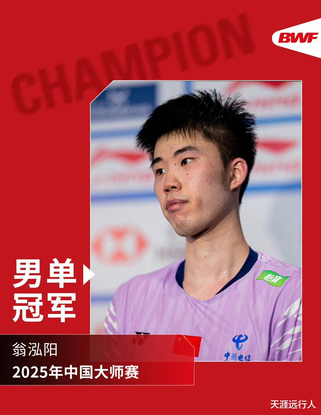 国羽26岁的翁泓阳,以21-11, 21-15,横扫中国台北球员林俊易,取得双方交手五连胜,获得本届中国大师赛男单冠军,收获本赛季个人第二冠,也是职业生涯的第七项世界羽联超级巡回赛男单冠军,中国队男单组时隔8年,再次捧起中国大师赛男单冠军,上一次登顶还是2017年的田厚威。