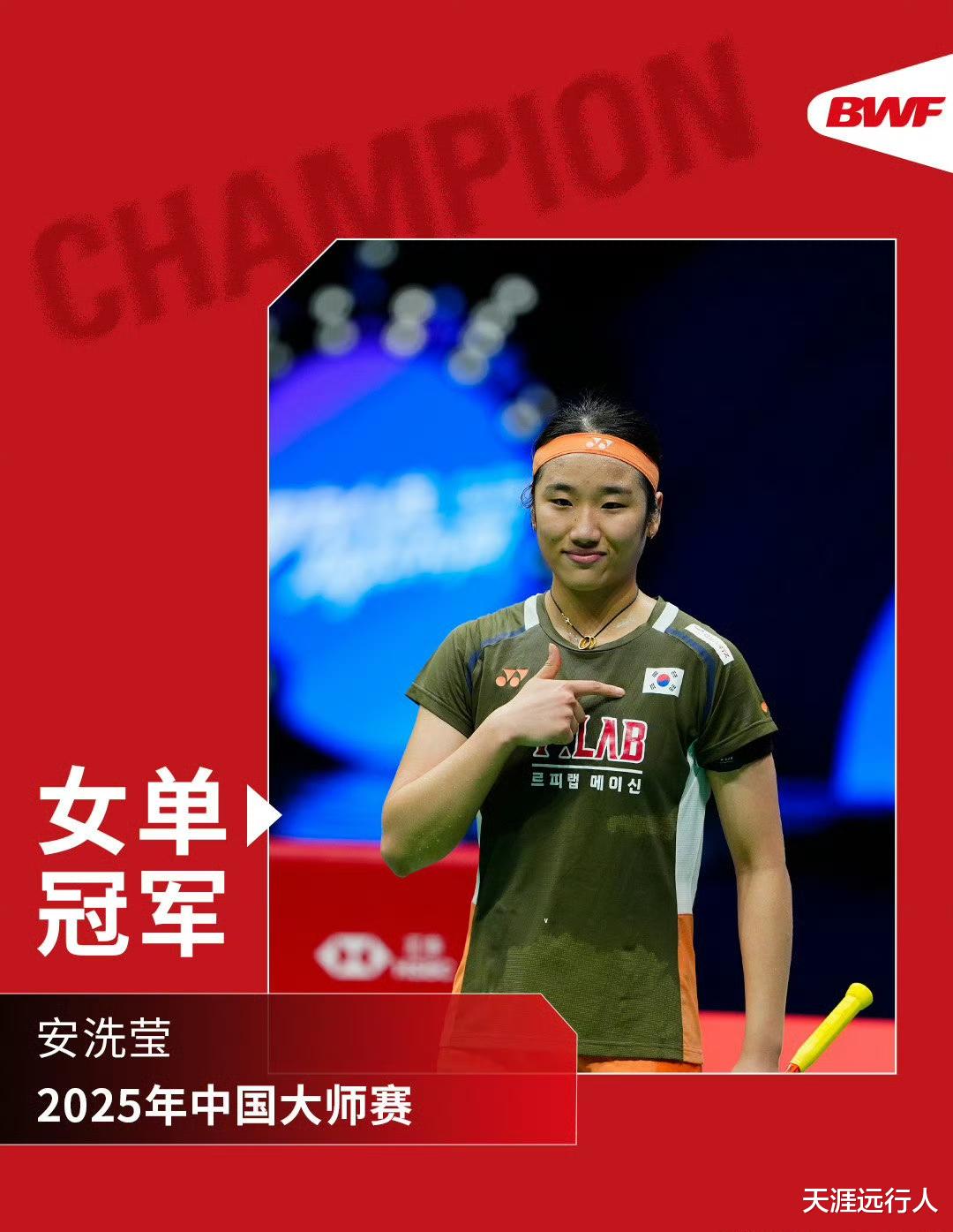 国羽现世界排名第三的韩悦,以11-21, 3-21,脆败于世一姐韩国安洗莹,第二局3-21的比分说明了一切,遗憾摘银,安洗莹为不到两个月前中国公开赛半决赛的失利复仇,那一场韩悦直接把小安子打退赛,安洗莹卫冕女单冠军,收获本赛季的第七项冠军,也是其职业生涯的第30项世界羽联超级巡回赛女单冠军,本年度的胜负场次来到49-3,三场中两场负于陈雨菲,一场是在中国公开赛上负于韩悦。