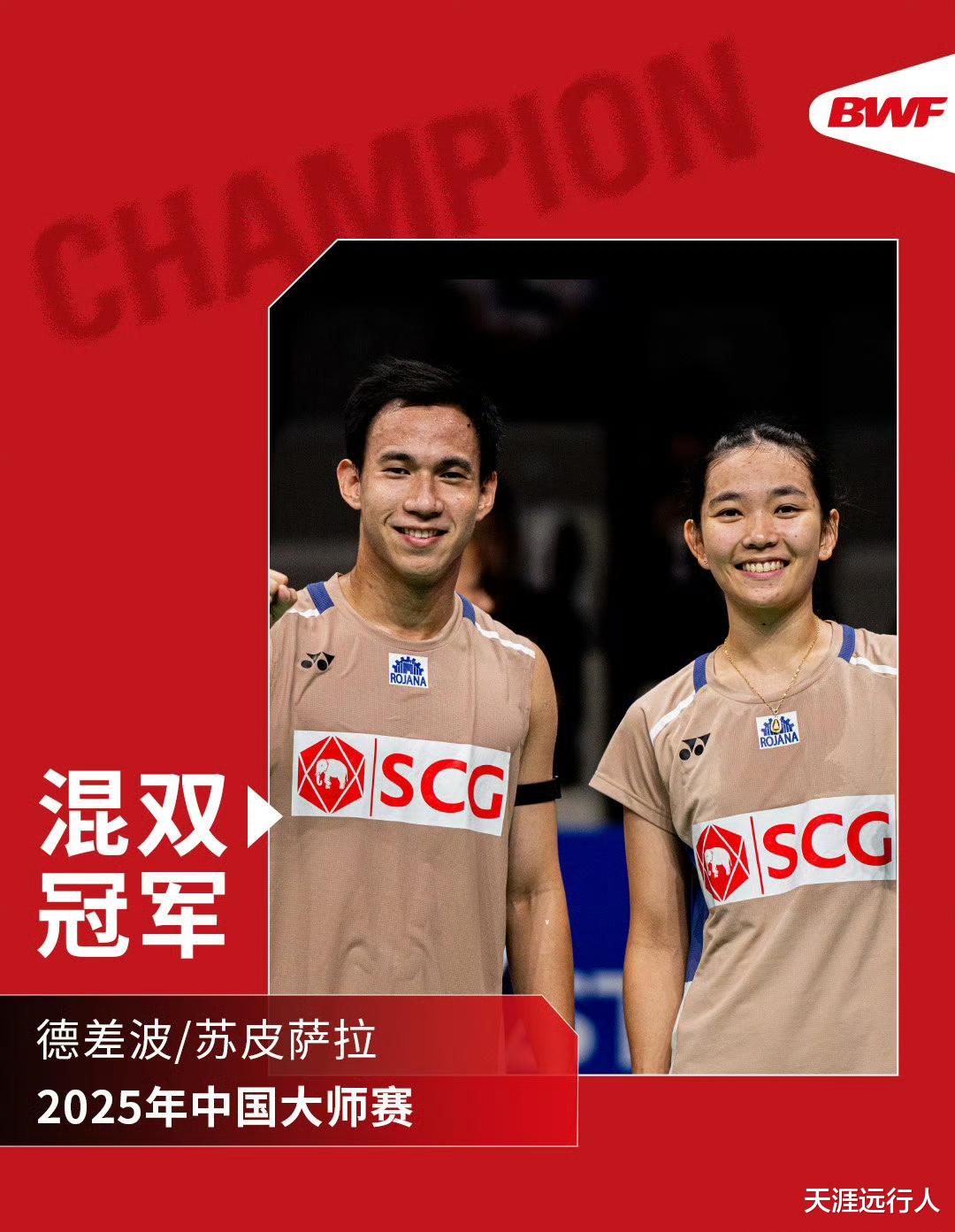 泰国组合德差波/苏皮萨拉,以21-8, 21-17,直落两局,横扫新科世锦赛冠军、此前连续两场力胜国羽世界排名第一、二的丫邦和凤凰组合的大马组合陈堂杰/杜颐沩,取得双方交手的三连胜,获得中国大师赛混双冠军,摘下本赛季第四冠,也是其两人职业生涯合作以来的第六项世界羽联超级巡回赛混双冠军。