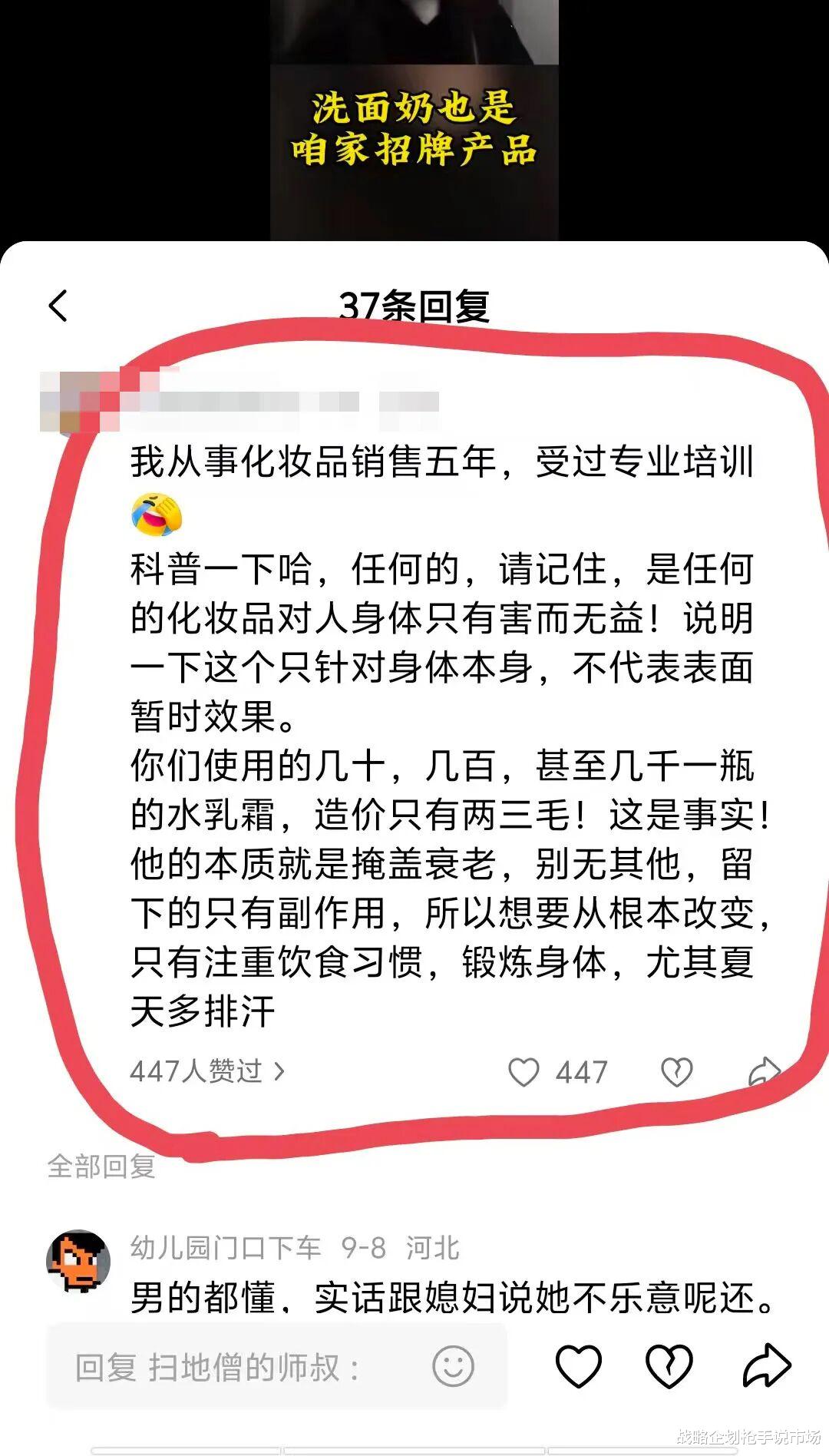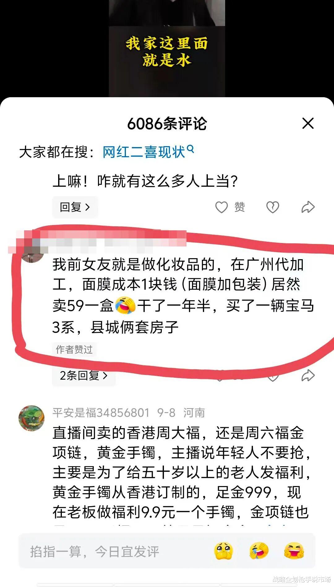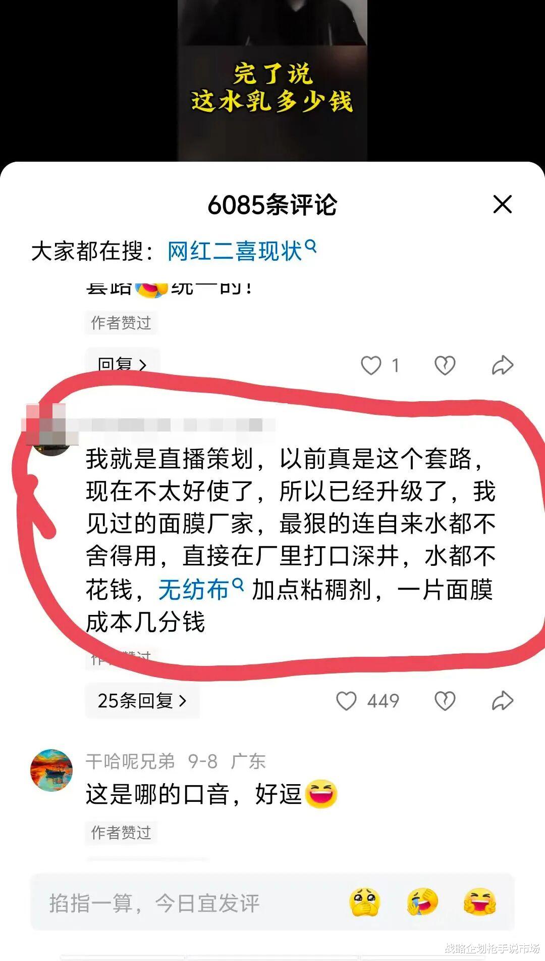 一个说“我就是直播策划,以前真是这个套路,现在不太好使了,所以已经升级了,我见过的面膜厂家,最狠的连自来水都不舍得用,直接在厂里打口深井,水都不花钱,无纺布加点粘稠剂,一片面膜成本几分钱”。