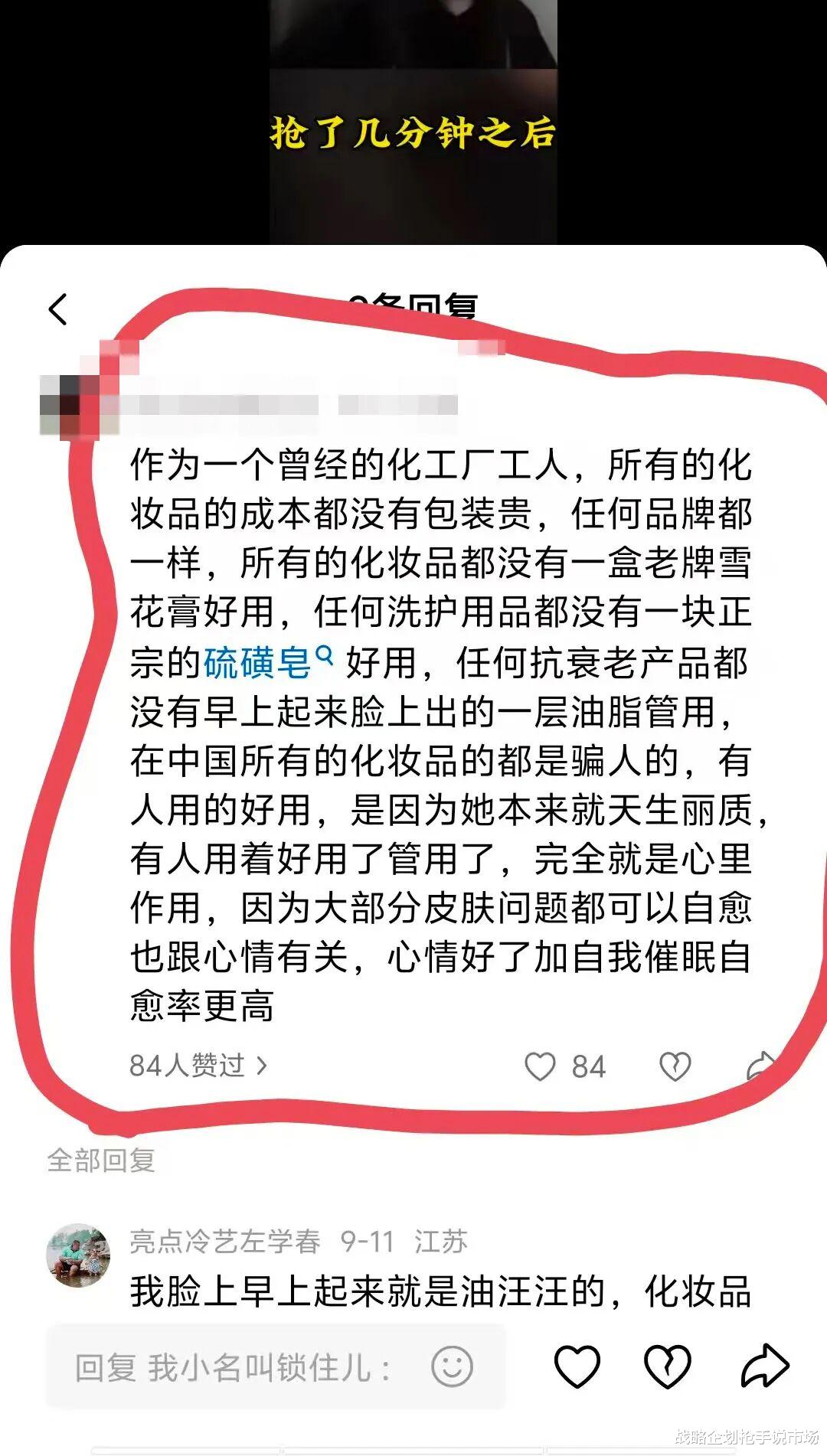 第四位说了,“作为一个曾经的化工厂工人,所有的化妆品成本都没有包装贵,任何品牌都一样,所有的化妆品都没有没有一盒老牌雪花膏好用,任何洗护用品都没有一块正宗的硫磺皂好用,任何抗衰老产品都没有早上起来脸上出的一层油脂管用,在中国所有的化妆品都是骗人的,有人用的好用是因为她本来天生丽质,还有人是心理作用,因为大部分皮肤问题都可以自愈,心情好了加自我催眠自愈率更高。”