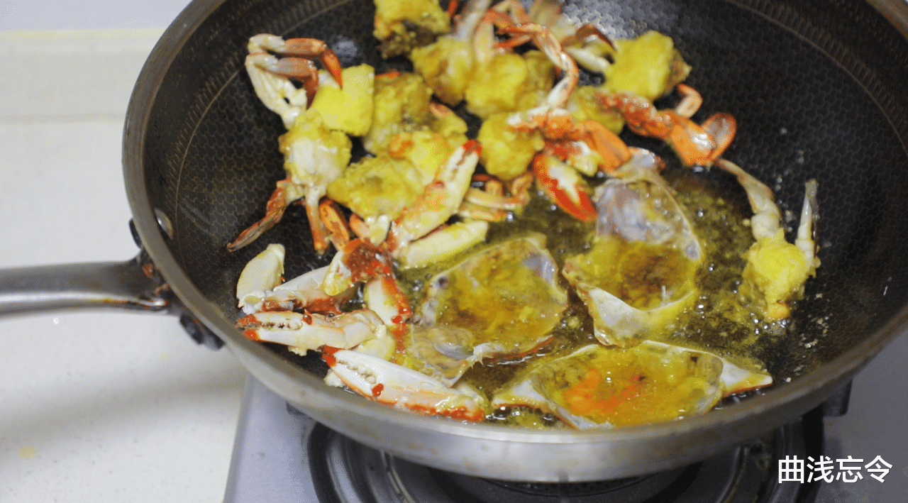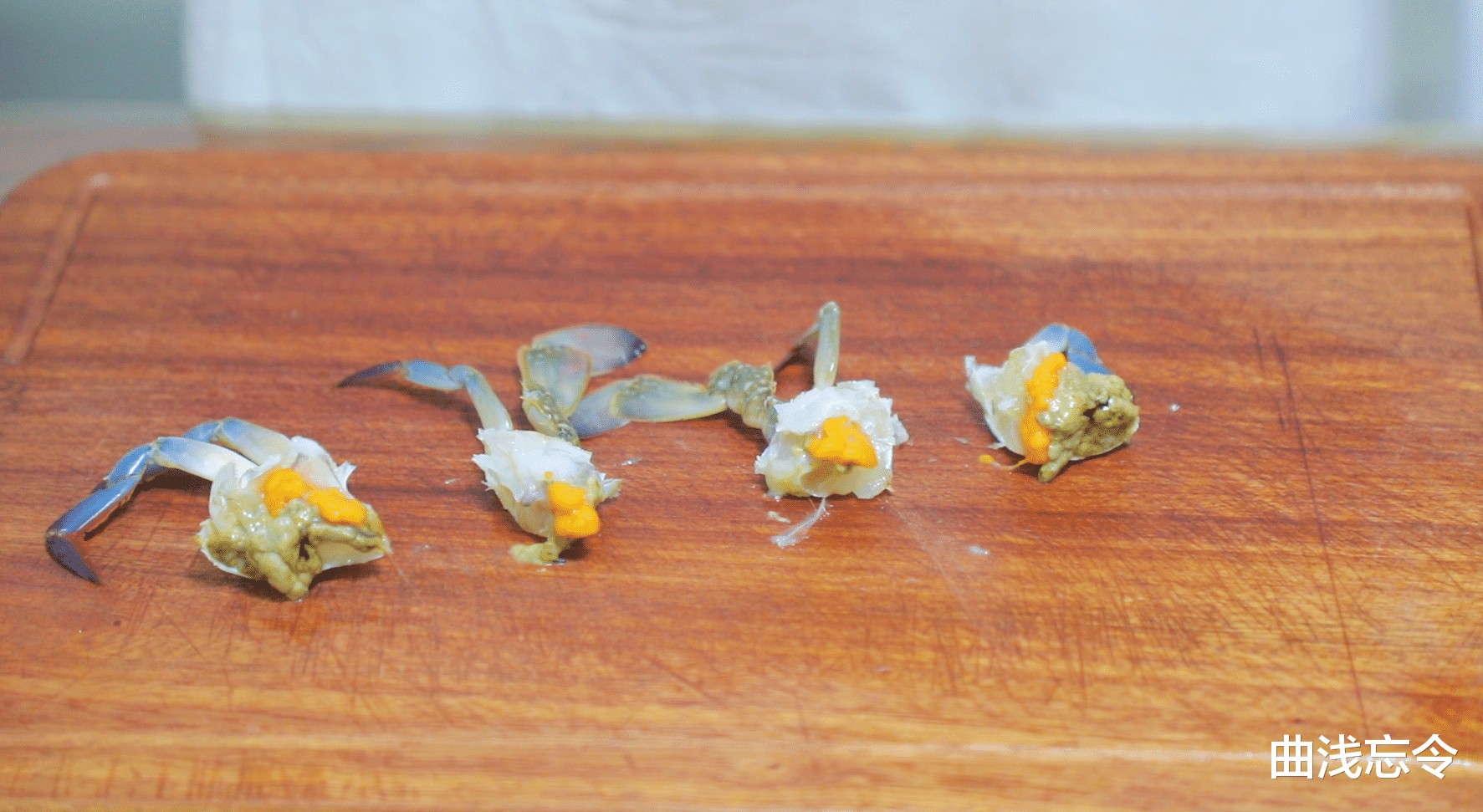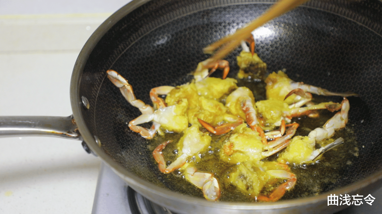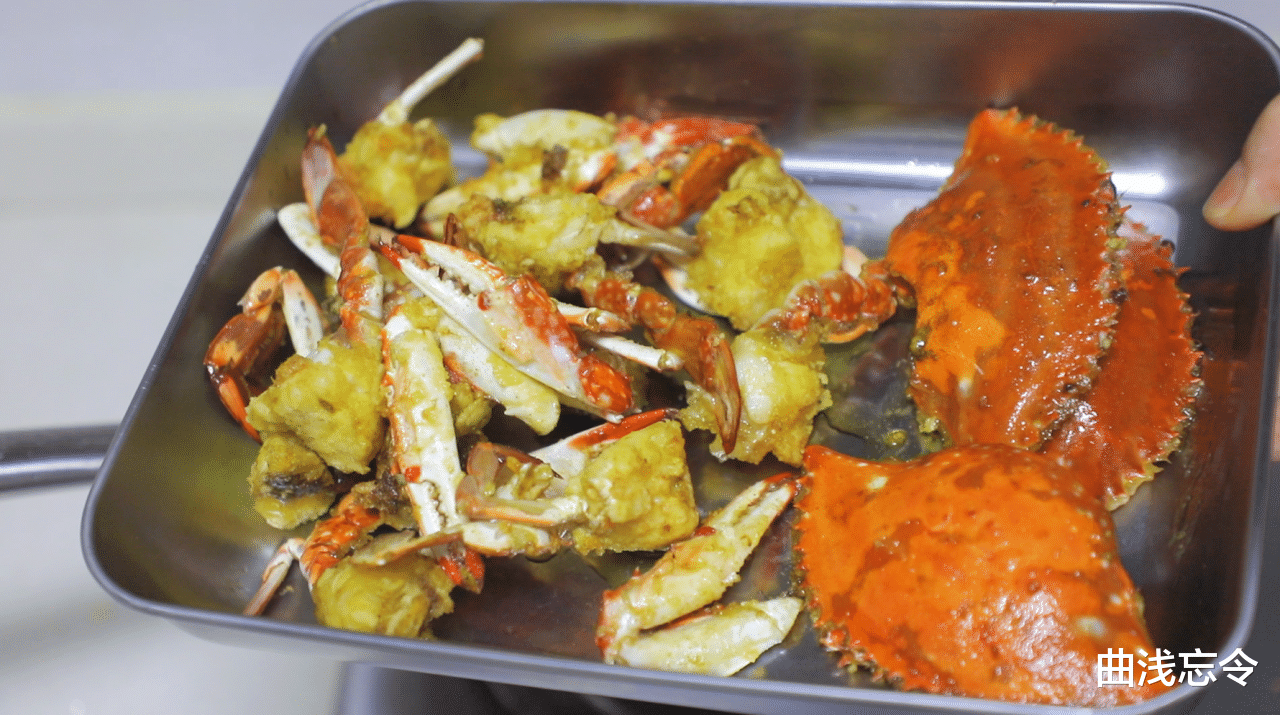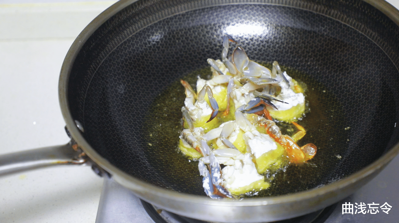 5.炸梭子蟹时,先将蟹肉块切面向下,等切面凝固封口后,再横下来继续炸,避免蟹肉里水分流失。炸至金黄即可,不要炸糊了。