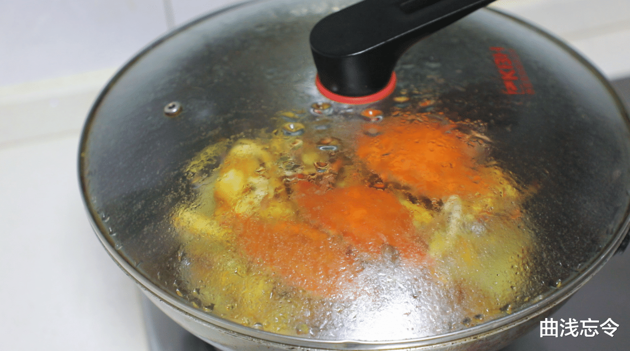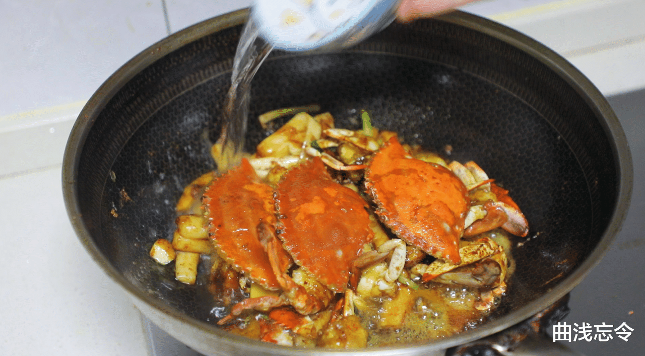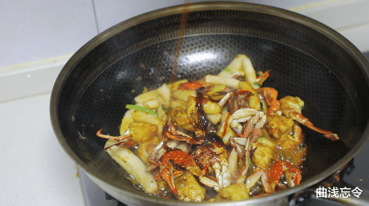 7、调味:加入白糖少许、生抽2勺、老抽半勺、耗油半勺、料酒2勺、(尝下咸淡根据口味看是否加盐,一般情况已经不用加盐,如果不喜欢加老抽和蚝油,可能还需要加少许盐,请自行斟酌。),翻炒均匀。最后在食材最上面摆放好蟹壳,加入半碗清水,关上锅盖,焖煮3分钟左右。