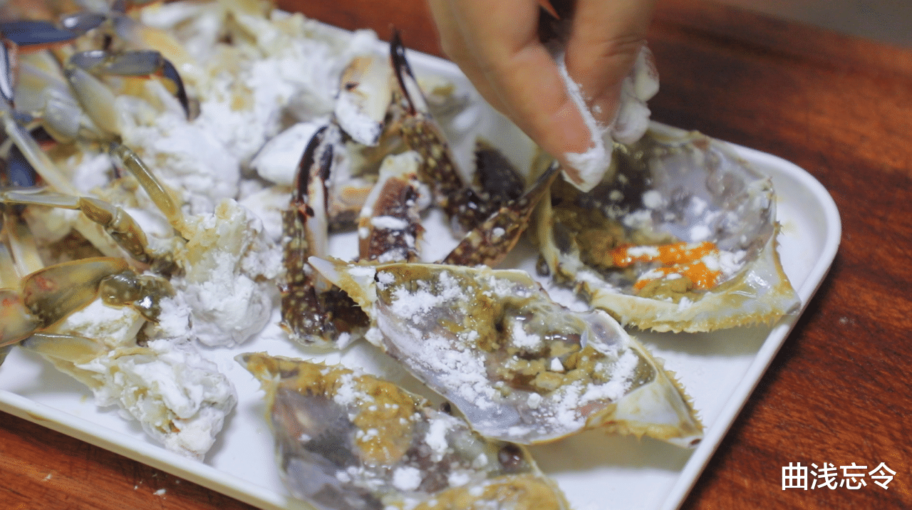 3、粘淀粉:将蟹肉切面蘸上适量土豆淀粉或玉米淀粉,蟹钳和蟹壳内也撒适量干淀粉,依次处理完放置一旁备用。