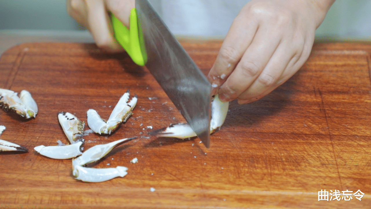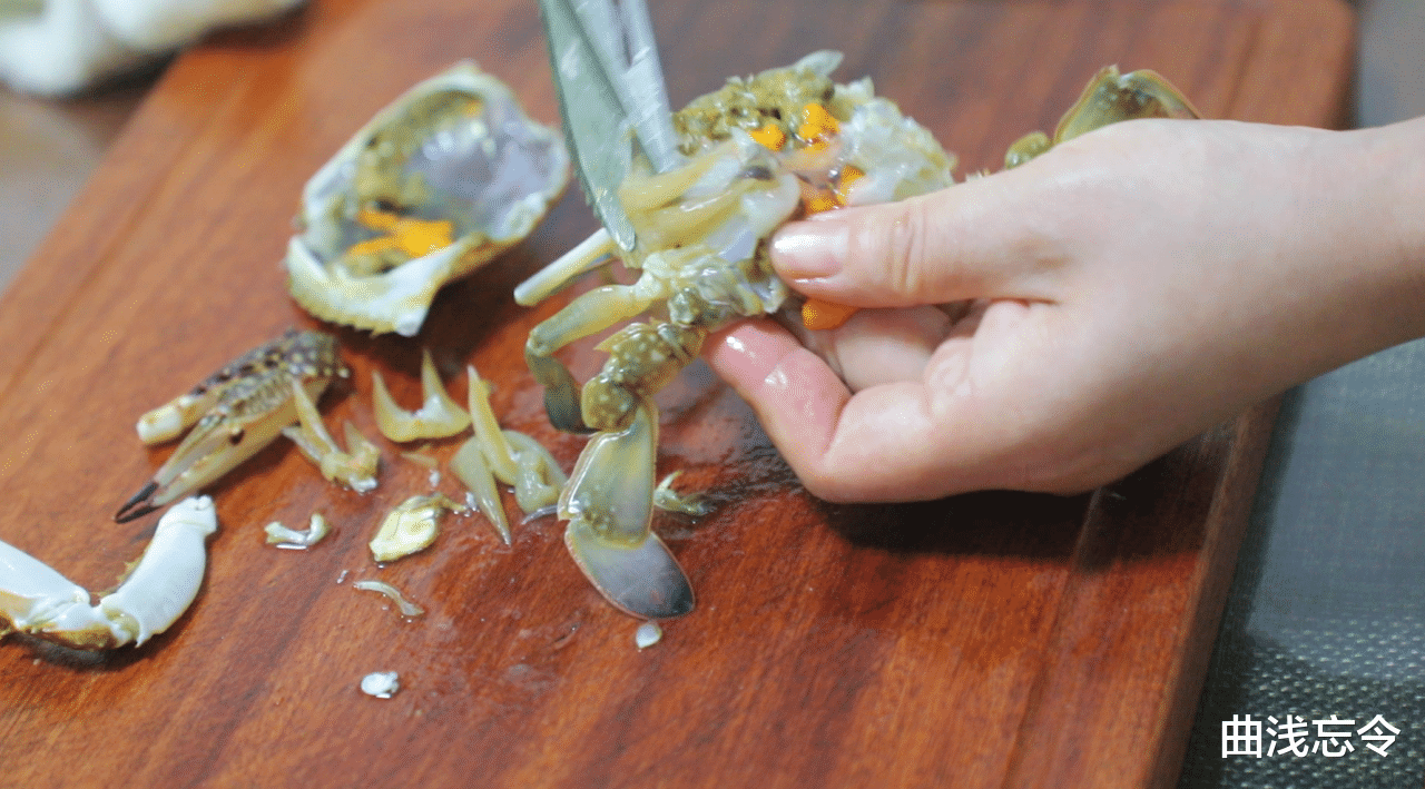 2、将蟹剁成4大块。蟹钳用刀背拍开更容易入味。