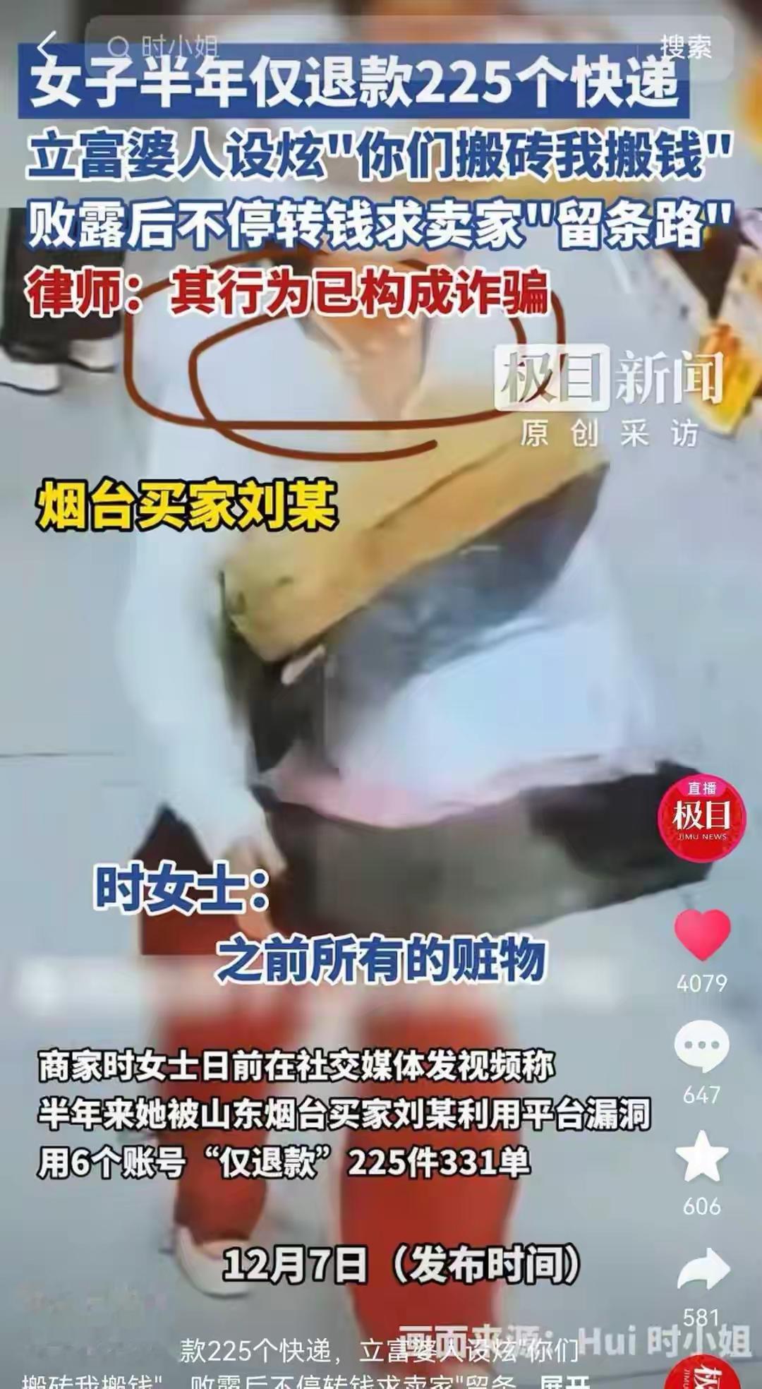 #“仅退款”225件快递女子已归案#山东烟台一女子刘某“发财致富”另辟新路,在快递上利用“仅退款”狠狠的赚了“财富”。至12月8日东窗事发,刘某已入案