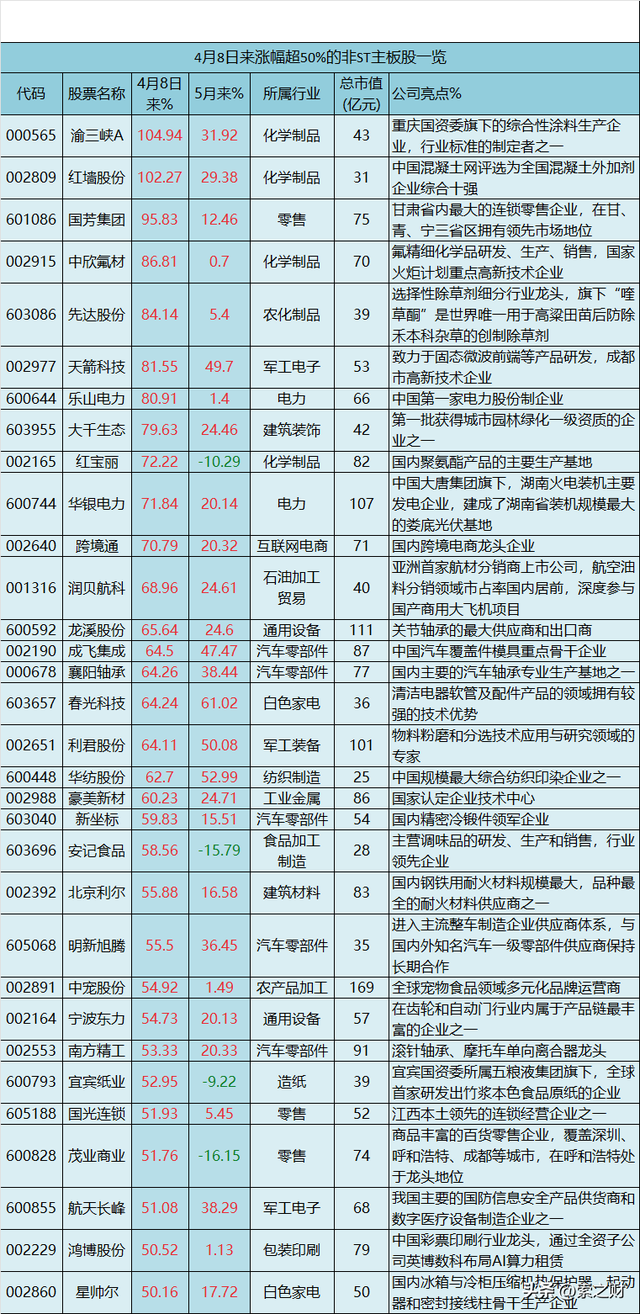 其中,领涨股渝三峡A(4月8日来涨104.94%)与红墙股份(4月8日来涨102.27%)均属化学制品板块。5月以来,春光科技、利君股份和华纺股份涨幅在50%以上,表现抢眼。但也有部分个股如红宝丽、安记食品和茂业商业在5月出现显著回调,值得大家注意。