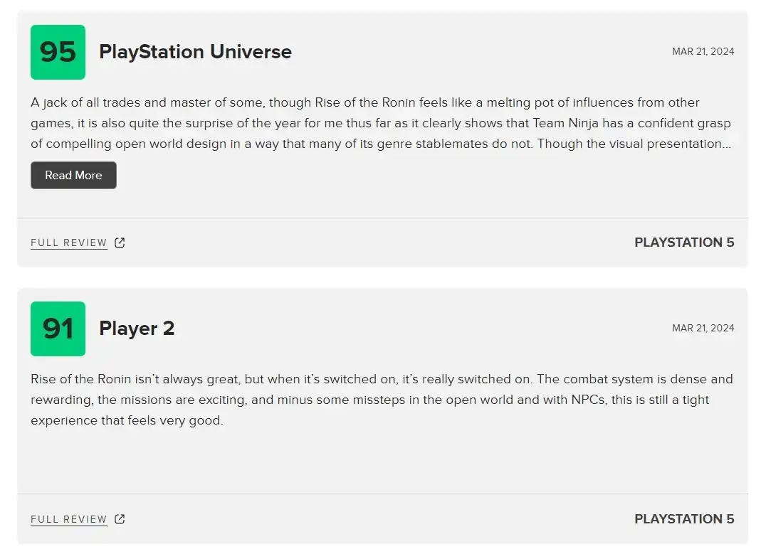 事实上,自《浪人崛起》于2024年3月22日在PS5独占发售,游戏就在知名评分汇总网站Metacritic上取得76分的总评好成绩。