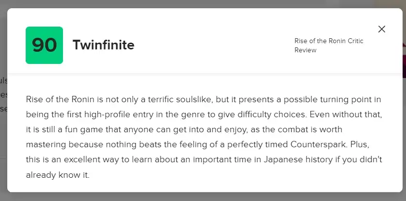 《浪人崛起》不仅是一部非常棒的灵魂之作,它还是该类型中第一部给出了难度选择的高调之作——这可能会是游戏史上的转折点。即使没有这一点,本作仍然是一个有趣的游戏,任何人都可以进入并享受,因为战斗是能够被所有玩家掌握的,没有什么比完美的弹反时机被掌握到时的感觉更美妙了。另外,如果你还不知道日本历史上的幕府末代和明治维新时期,游玩本作也不失为是一个好方法。