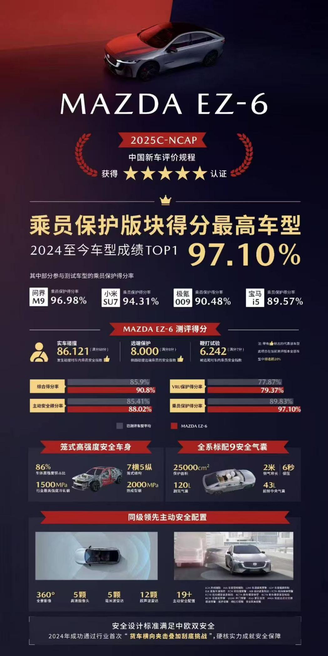 在汽车行业的激烈竞争中,安全始终是无法妥协的第一优先,而在这一领域,长安马自达MAZDA EZ-6无疑树立了全新标杆。在2025年的C-NCAP(中国新车评价规程)测试中,MAZDA EZ-6以乘员保护得分率97%的卓越表现荣获五星安全评价。这一成绩不仅彰显了EZ-6卓越的安全设计和工程技术,也为市场消费者提供了更强大的购车信心。