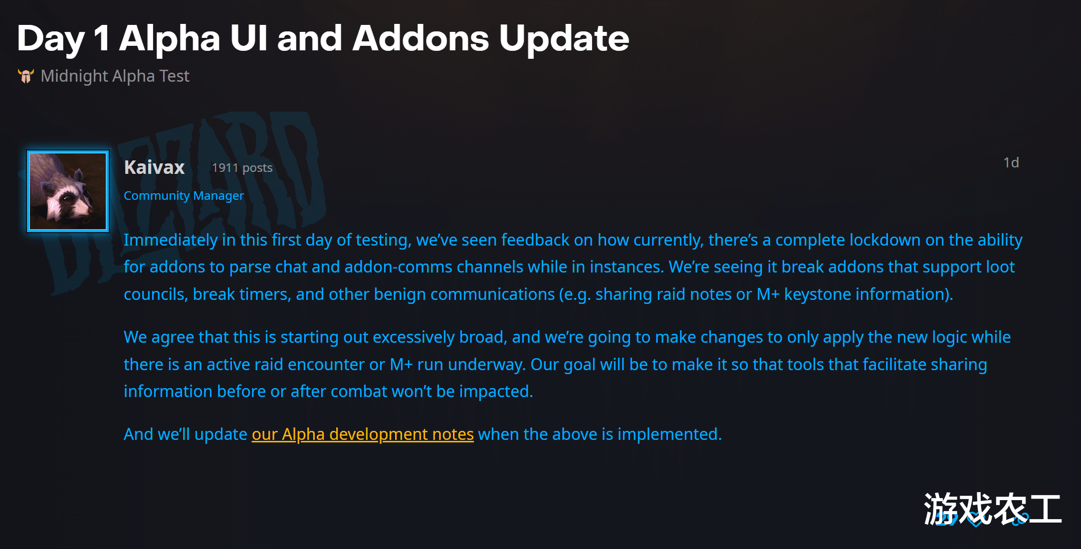 而最新蓝贴显示暴雪将针对该禁止进行调整,不过大家也先不要高兴太早,因为这个调整并没有对团本放宽要求,而是针对团本以外的场景放宽要求,但是作者觉得目前这个针对非团本放宽要求的实际价值并不大,更多是给玩家们一个希望,或者是让这些插件作者不停止更新,可以在其他场景下继续发挥完善插件的功能。