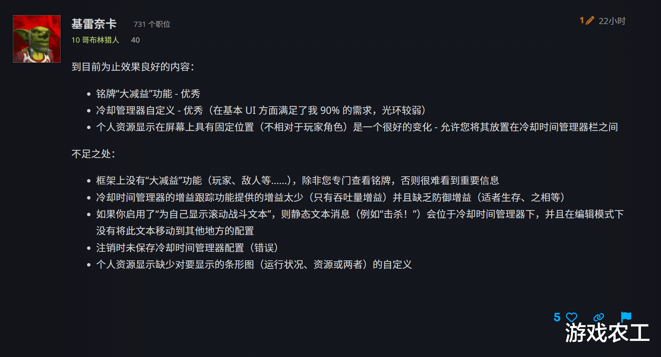 而根据评论区中玩家的评论来看,确实新版本的魔兽世界已经可以抛弃掉大部分的插件,根据该玩家的说法,目前针对一些原本插件才能显示的功能现在已经完美显示了,而一些目前暂时无法进行替代插件的,比如说缺少一些冷却时间管理器配置之类的,不过既然官方禁止了,估计后续应该会进行完美补上,让玩家们不需要依靠插件也能玩。