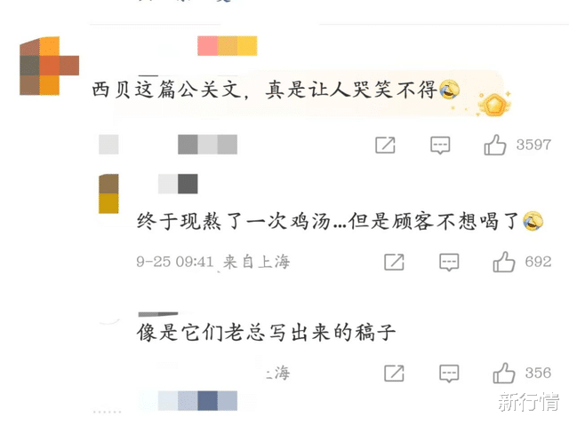 网友们纷纷表示,“西贝这篇公关文,真是让人哭笑不得”“终于现熬了一次鸡汤….但是顾客不想喝了”“像是它们老总写出来的稿子”……