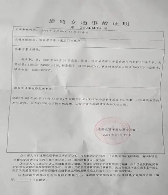 记者在涉县清泉路消防救援站出具的《接警出动表》上看到关于此事件的详细描述:“2024年4月9日11时45分,涉县消防救援大队接到报警称:在涉县君子居南门附近有一车辆起火,涉县清泉路消防救援站出动2部消防车,10名消防救援人员赶赴现场处置。11时51分到达现场,现场为电动汽车着火,12时26分处置完毕无人员伤亡”。在邯郸市公安局交通巡逻警察支队涉县大队4月19日出具的第20240409号道路交通事故证明中关于<调查交通事故得到的事实>一栏中显示:“2024年4月09日11时33分许,牛某驾驶吉ADK4376小型汽车沿君子居牛魔王门口路段由西向东行驶时,吉ADK4376小型轿车轮胎碾压石板后致石板碰撞底盘后发生自燃”。