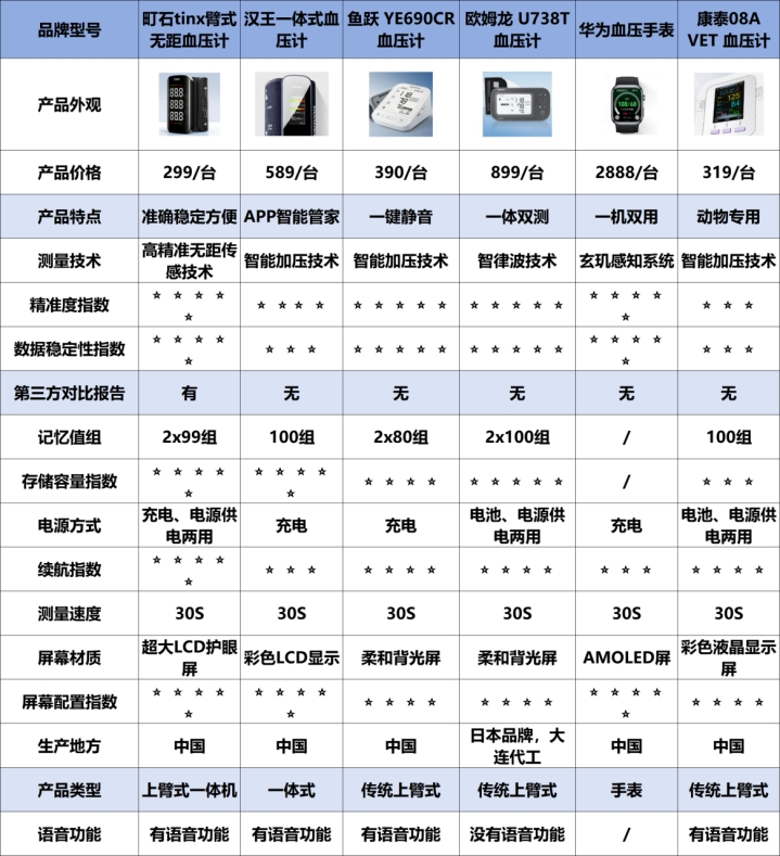 不想盲目选择血压计?那就先看一下下面的对比表格吧。通过对比表格中的数据,大家可以轻松了解到几款血压计的实际表现。接下来,我会逐一分析每款产品的特点,让你更加清楚这些血压计的优势和短板,做出更加明智的决定。