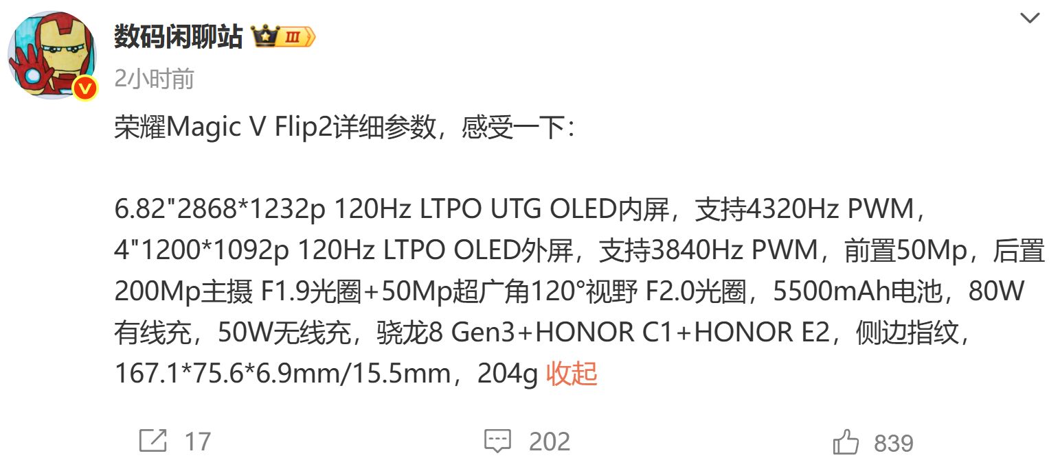 8月14日,博主@数码闲聊站在社交平台曝光了荣耀Magic V Flip2的详细参数信息,包括性能、屏幕、电池、影像等方面。