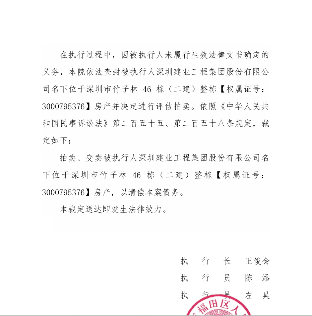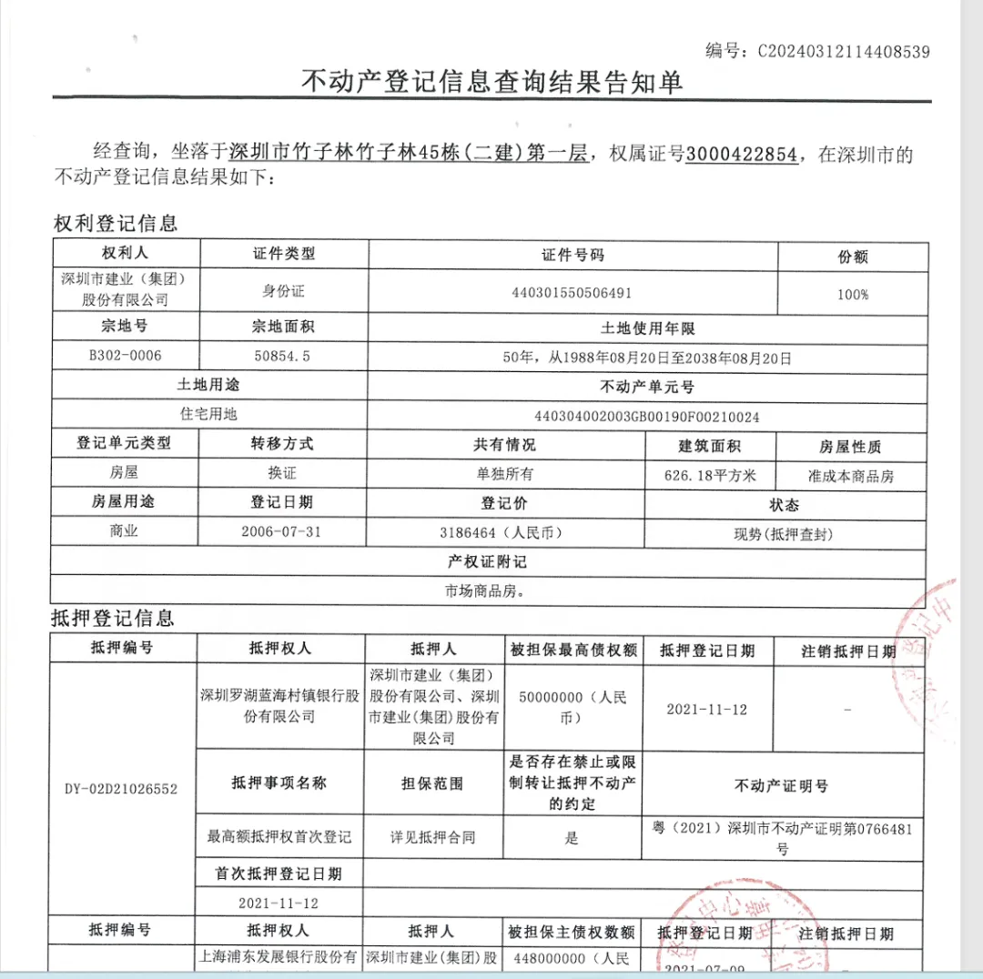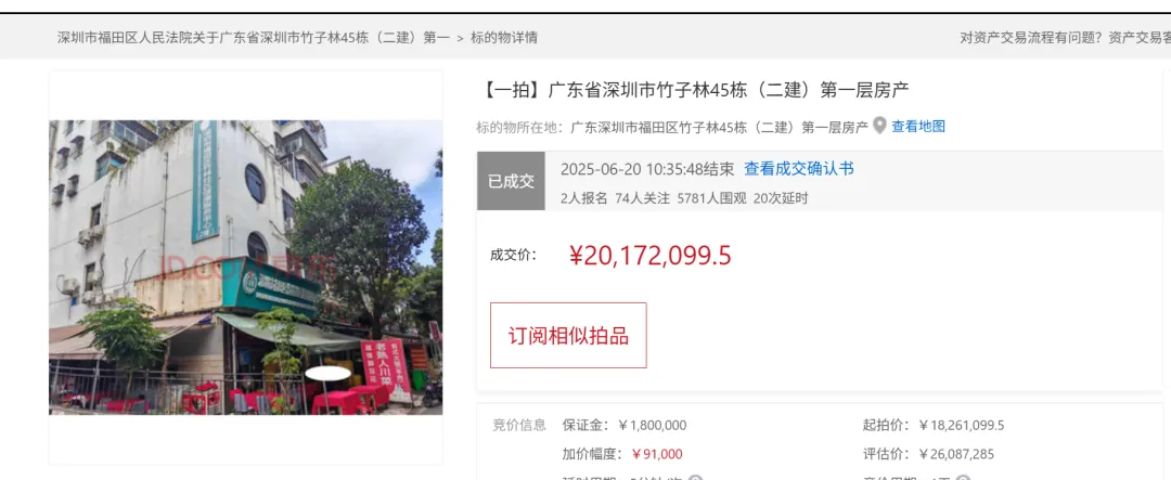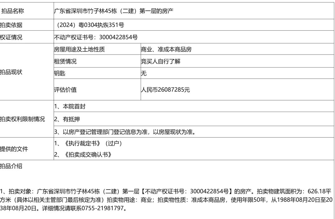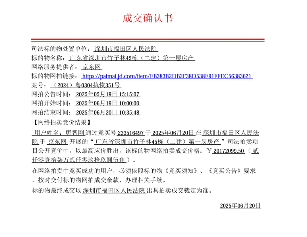 我们来看看福田区人民法院2025年6月20日隔壁45栋【一拍】广东省深圳市竹子林45栋(二建)第一层房产也是债务人名下资产同样抵押在浦发银行深圳分行拍卖成交情况: