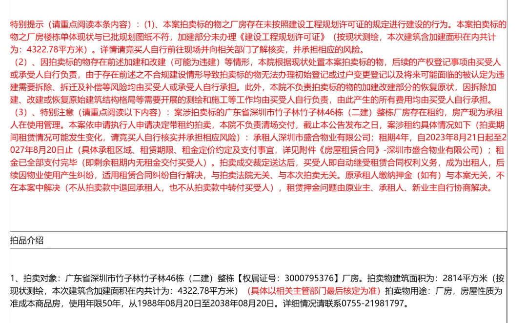 特别注意(请重点阅读以下内容):案涉拍卖标的广东省深圳市竹子林竹子林46栋(二建)整栋厂房存在租约,房产现为承租人在使用管理。本案依申请执行人申请决定带租约拍卖,本院不负责清场交付,截止本公告发布之日,案涉租约具体情况如下(拍卖期间租赁情况可能发生变化,请竞买人自行核实并承担相应风险):承租人深圳市盛合物业有限公司;租期4年,自2023年8月21日起至2027年8月20日止(具体承租区域、租赁期限、租金定价约定及支付事宜,详见附件《房屋租赁合同》-深圳市盛合物业有限公司);租金已全部支付完毕(即剩余租期内无租金交付买受人)。拍卖成交裁定送达后,买受人即自动继受租赁合同权利义务,成为出租人,后续因物业使用产生纠纷,适用租赁合同纠纷自行解决,与拍卖法院无关、与本次拍卖无关。原承租人缴纳押金(如有)与本案无关,不在本案中解决(不从拍卖款中退回承租人,也不从拍卖款中转付买受人),租赁押金问题由原业主、承租人、新业主自行协商解决。
