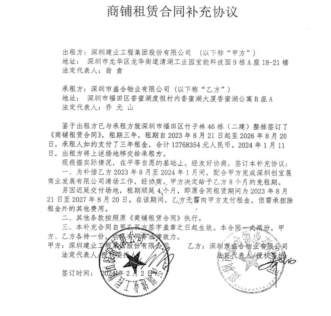 该协议签订的出租面积为3940.85平方米,租赁期限为36个月即2023年8月23日到2026年8月21日,租赁期间租金合计12768354元,该笔租金一次性乙方支付给乙方。由于甲方交付及其他原因导致延期实际租约到期时间双方约定到2027年8月21日。按照租期36个月核算实际租赁面积3940.85平方米,折合单价90元每平方米每月。