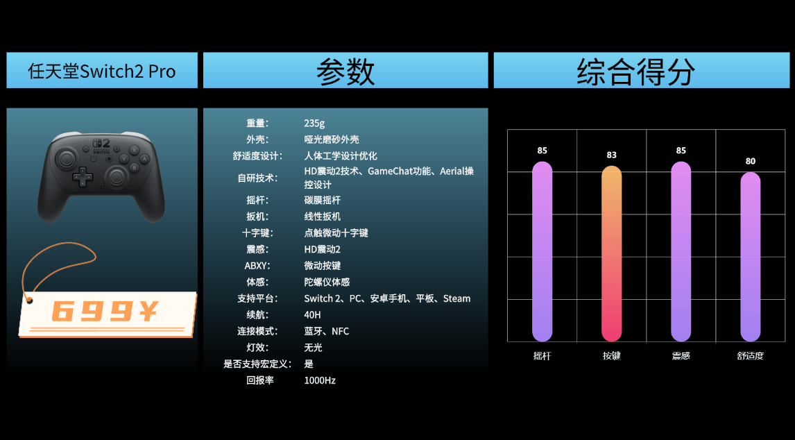 兼容性方面能适配Switch、PC、电视、Steam等多种设备,日常换着玩不用频繁配对,省心省力的。蓝牙连接稳定性尚可,无线使用时信号传输比较稳定,基本不会出现断连情况。内置的HD音圈马达能提供一定的震感反馈,不算特别强烈,但也增添几分游戏沉浸感,字符切换功能在切换游戏模式时也挺实用。