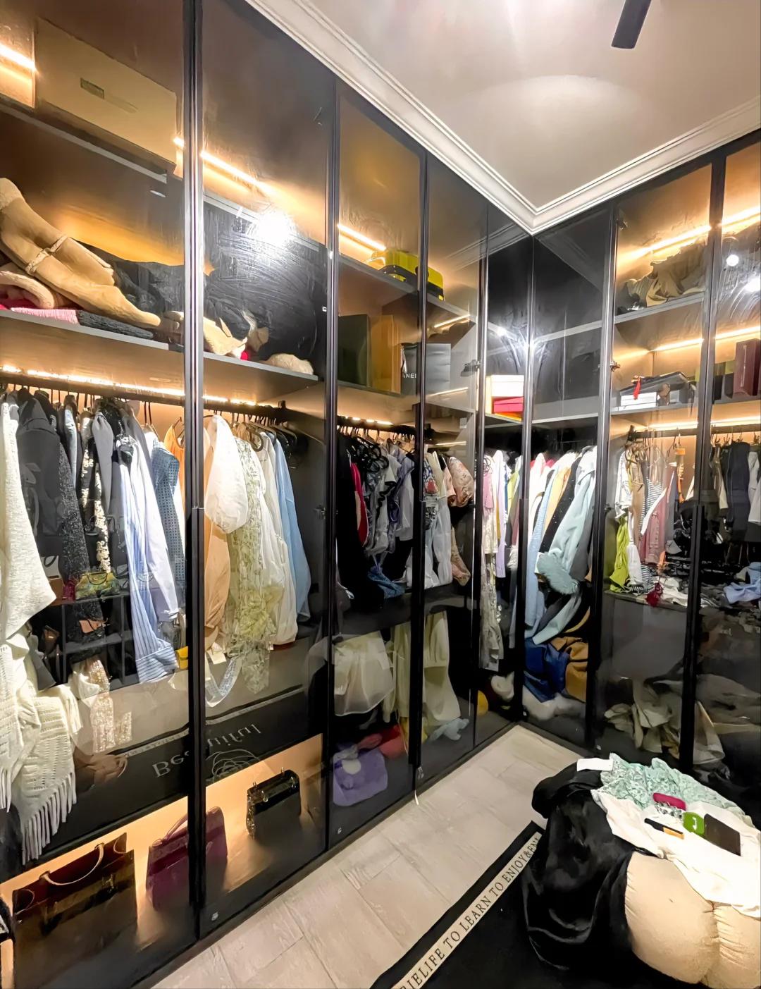 玻璃材质衣帽间虽然玻璃材质很通透,但家里有些地方真的少用。比如说玻璃茶几,放个杯子就很响。还有玻璃衣帽间,不管你怎么收拾在外面看来都很显乱。还有乱拿乱放的习惯,入住不了一个星期时间,看上去就乱成一片,要不断收拾才行。
