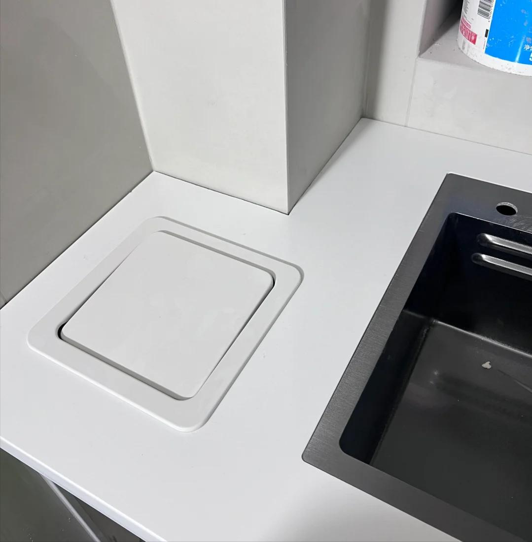 隐藏式垃圾桶把垃圾桶设计在橱柜可以解决垃圾桶放在地面上绊脚;边切菜就能随手丢垃圾,一点都不需要弯腰;还能提升厨房整洁效果。我也是这么做的,入住后真的想砸了。