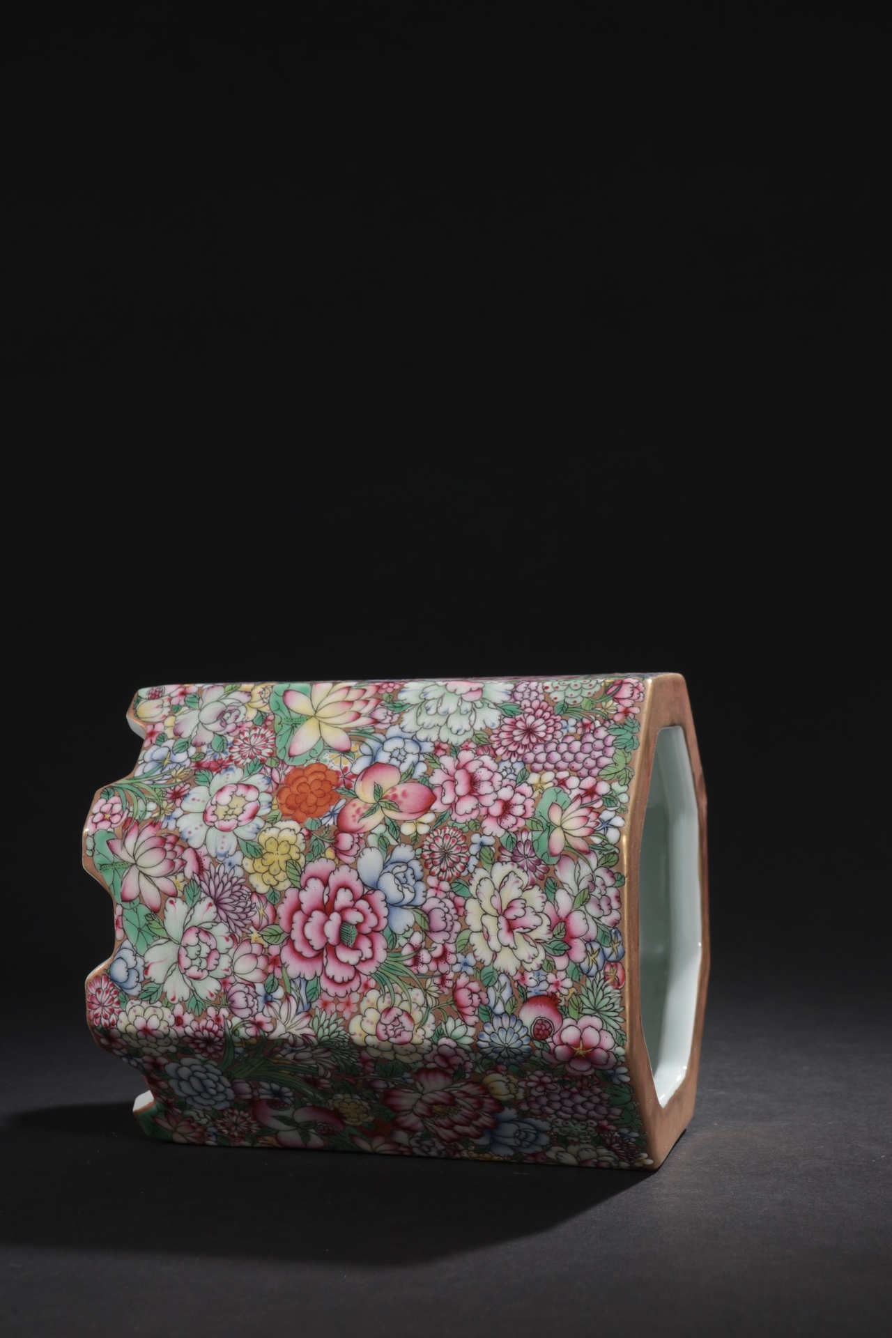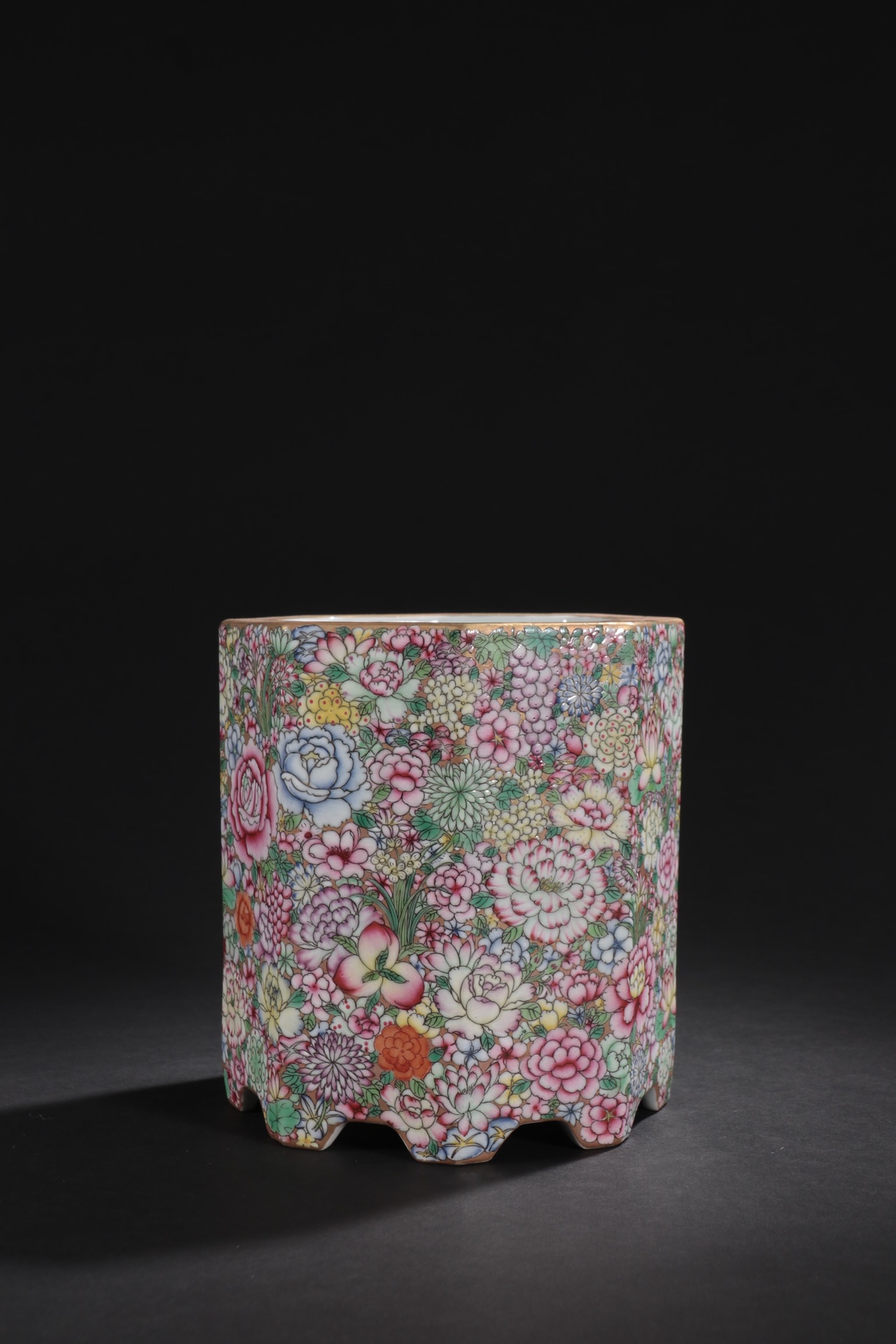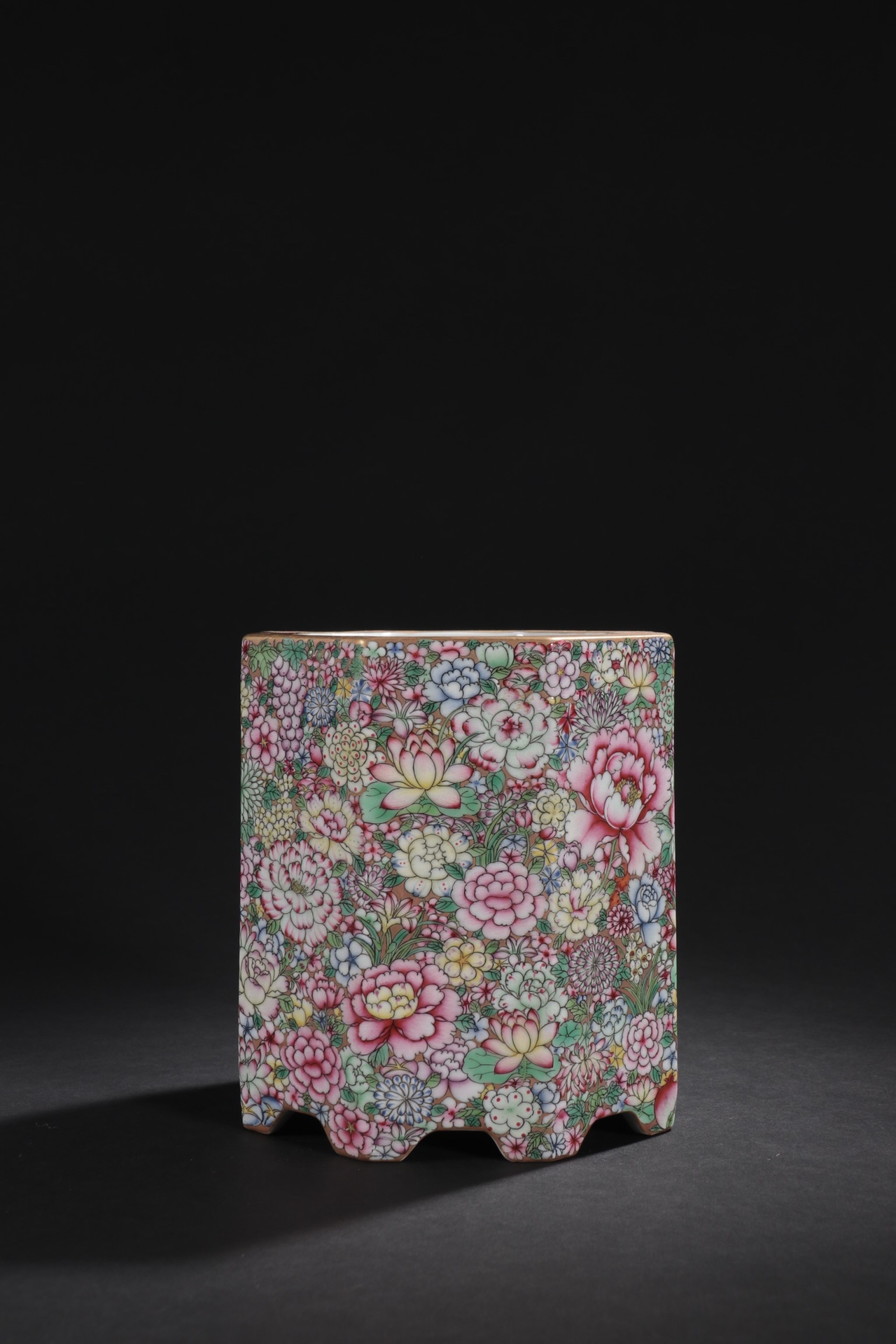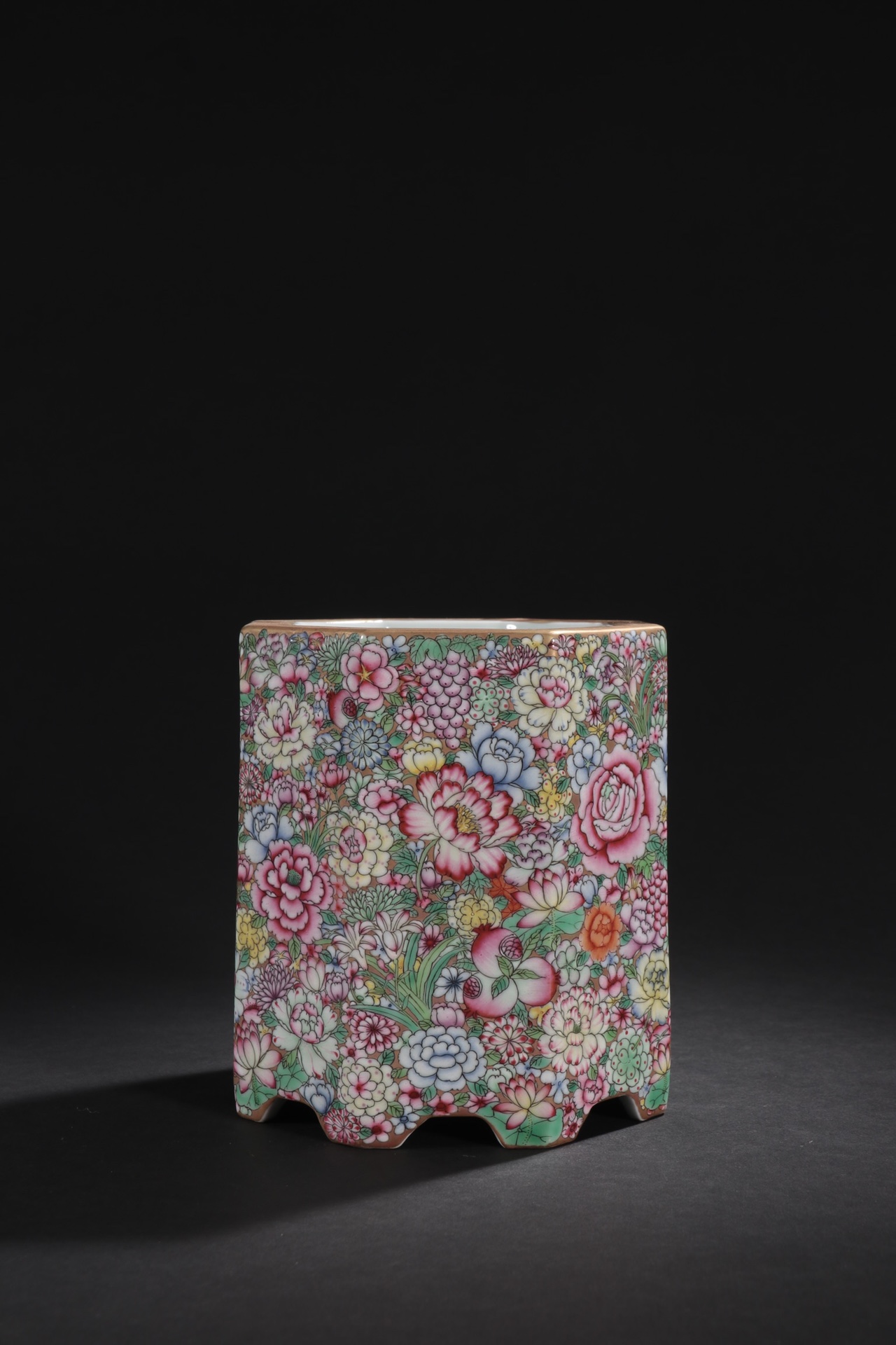 回流-粉彩百花不落地八方笔筒 规格:高15.5cm直径13.5cm 简介:藏品器形雅致饱满,呈八方形,胎质细腻,采用粉彩