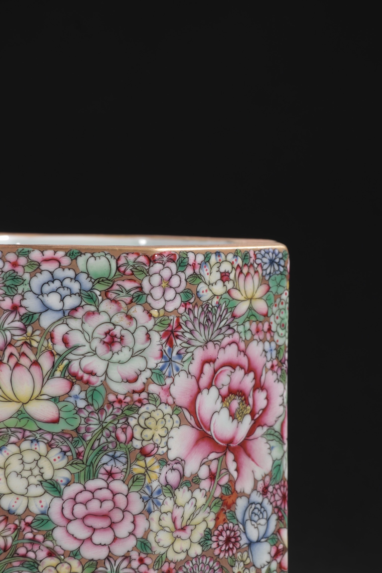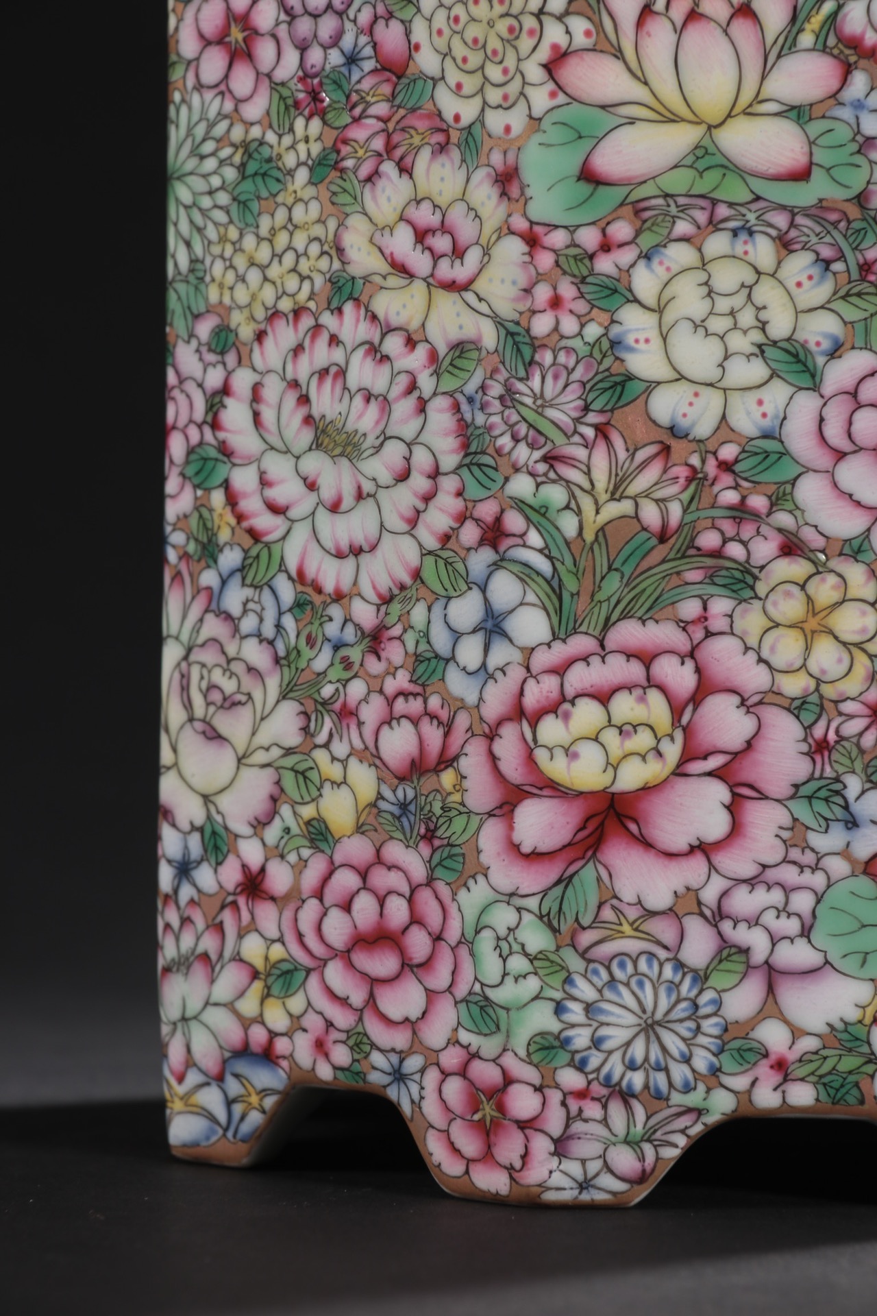 回流-粉彩百花不落地八方笔筒 规格:高15.5cm直径13.5cm 简介:藏品器形雅致饱满,呈八方形,胎质细腻,采用粉彩工艺,绘画百花不落地图案,绘画精美,纹饰清晰漂亮,底部落款清晰,文房陈列精品。