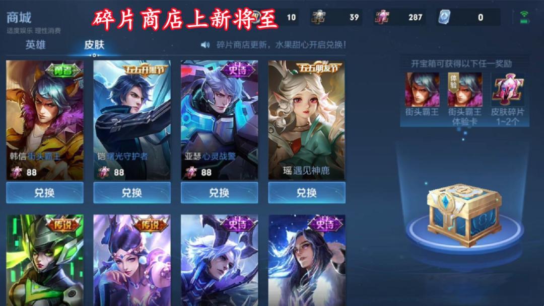 碎片商店也将进行更新轮换,会有一批史诗皮肤进行上架,例如,铠-曙光守护者、瑶-遇见神鹿、西施-诗语江南、孙策- 猫狗日记、钟馗 -乐园奇幻夜、诸葛亮-黄金分割率等皮肤,都极有可能进入皮肤碎片商店供玩家兑换。