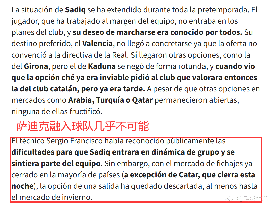 整个夏天都渴望离队的萨迪克最终也没有离队成功,他一直都在单独训练,主教练弗朗西斯科曾公开表态,让他融入球队并成为球队一员存在困难。