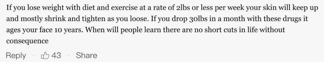 “如果每周通过运动瘦1公斤,皮肤松紧能跟得上这速度。但如果你1个月通过药物瘦14公斤,脸应该会衰老10岁。啥时候人们才知道人生的捷径都有后果?”