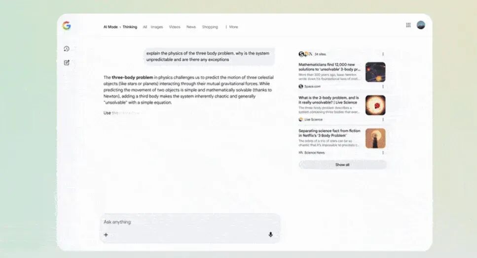 在谷歌搜索的 AI Mode 中,Gemini 3 Pro 也会以更直观的方式呈现结果,包括图片、表格、网格甚至模拟内容。