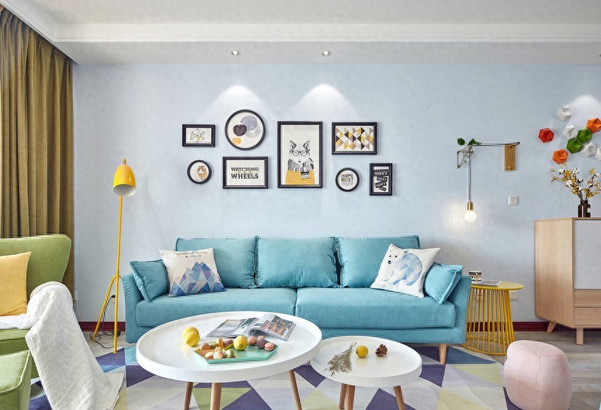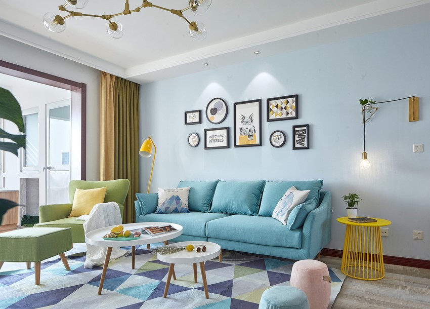 背景墙还挂上了艺术照作为装饰背景,简单又好看,整个客厅色彩上的搭配真的让人很喜欢,活力满满。
